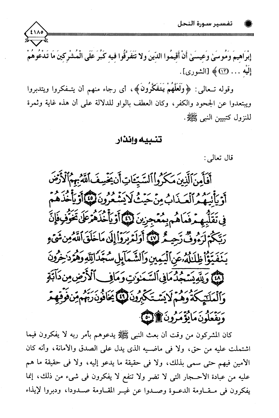 (أَفَأَمِنَ الَّذِينَ مَكَرُوا السَّيِّئَاتِ أَنْ يَخْسِفَ اللَّهُ بِهِمُ الْأَرْضَ أَوْ يَأْتِيَهُمُ الْعَذَابُ مِنْ حَيْثُ لَا يَشْعُرُونَ (45) أَوْ يَأْخُذَهُمْ فِي تَقَلُّبِهِمْ فَمَا هُمْ بِمُعْجِزِينَ (46) أَوْ يَأْخُذَهُمْ عَلَى تَخَوُّفٍ فَإِنَّ رَبَّكُمْ لَرَءُوفٌ رَحِيمٌ (47) أَوَلَمْ يَرَوْا إِلَى مَا خَلَقَ اللَّهُ مِنْ شَيْءٍ يَتَفَيَّأُ ظِلَالُهُ عَنِ الْيَمِينِ وَالشَّمَائِلِ سُجَّدًا لِلَّهِ وَهُمْ دَاخِرُونَ (48) وَلِلَّهِ يَسْجُدُ مَا فِي السَّمَاوَاتِ وَمَا فِي الْأَرْضِ مِنْ دَابَّةٍ وَالْمَلَائِكَةُ وَهُمْ لَا يَسْتَكْبِرُونَ (49) يَخَافُونَ رَبَّهُمْ مِنْ فَوْقِهِمْ وَيَفْعَلُونَ مَا يُؤْمَرُونَ (50)