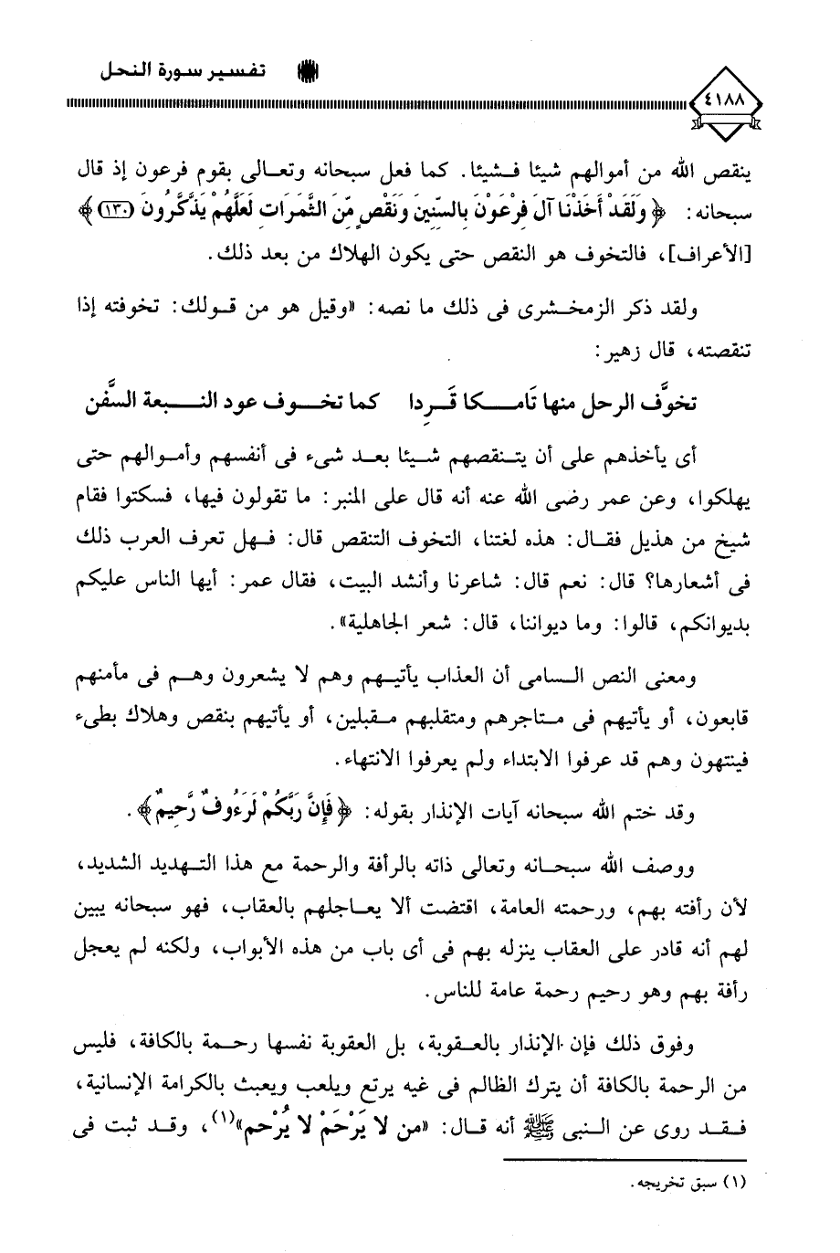 أي يأخذهم على أن يتنقصهم شيئا بعد شيء في أنفسهم وأموالهم حتى يهلكوا، وعن عمر رضي اللَّه عنه أنه قال على المنبر: ما تقولون فيها، فسكتوا فقام شيخ من هذيل فقال: هذه لغتنا، التخوف التنقص قال: فهل تعرف العرب ذلك في أشعارها؟ قال: نعم قال: شاعرنا وأنشد البيت، فقال عمر: أيها الناس عليكم بديوانكم، قالوا: وما ديواننا، قال: شعر الجاهلية ".