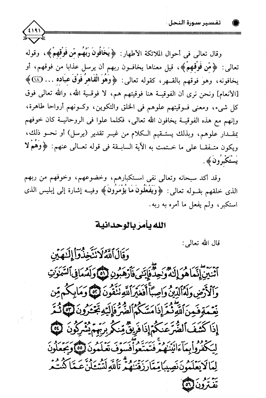 (وَقَالَ اللَّهُ لَا تَتَّخِذُوا إِلَهَيْنِ اثْنَيْنِ إِنَّمَا هُوَ إِلَهٌ وَاحِدٌ فَإِيَّايَ فَارْهَبُونِ (51) وَلَهُ مَا فِي السَّمَاوَاتِ وَالْأَرْضِ وَلَهُ الدِّينُ وَاصِبًا أَفَغَيْرَ اللَّهِ تَتَّقُونَ (52) وَمَا بِكُمْ مِنْ نِعْمَةٍ فَمِنَ اللَّهِ ثُمَّ إِذَا مَسَّكُمُ الضُّرُّ فَإِلَيْهِ تَجْأَرُونَ (53) ثُمَّ إِذَا كَشَفَ الضُّرَّ عَنْكُمْ إِذَا فَرِيقٌ مِنْكُمْ بِرَبِّهِمْ يُشْرِكُونَ (54) لِيَكْفُرُوا بِمَا آتَيْنَاهُمْ فَتَمَتَّعُوا فَسَوْفَ تَعْلَمُونَ (55) وَيَجْعَلُونَ لِمَا لَا يَعْلَمُونَ نَصِيبًا مِمَّا رَزَقْنَاهُمْ تَاللَّهِ لَتُسْأَلُنَّ عَمَّا كُنْتُمْ تَفْتَرُونَ (56)