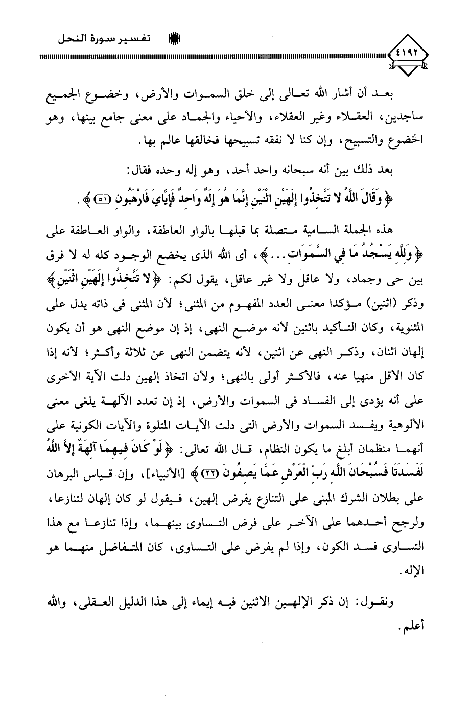 هذه الجملة السامية متصلة بما قبلها بالواو العاطفة، والواو العاطفة على (وَلِلَّهِ يَسْجُدُ مَا فِي السَّمَاوَاتِ. . .)، أي اللَّه الذي يخضع الوجود كله له لَا فرق بين حي وجماد، ولا عاقل ولا غير عاقل، يقول لكم: (لا تَتَّخِذُوا إِلَهَيْنِ اثْنَيْنِ) وذكر (اثنين) مؤكدا معنى العدد المفهوم من المثنى؛ لأن المثنى في ذاته يدل على المثنوية، وكان التأكيد باثنين لأنه موضع النهي، إذ إن موضع النهي هو أن يكون إلهان اثنان، وذكر النهي عن اثنين، لأنه يتضمن النهي عن ثلاثة وأكثر؛ لأنه إذا كان الأقل منهيا عنه، فالأكثر أولى بالنهي؛ ولأن اتخاذ إلهين دلت الآية الأخرى على أنه يؤدي إلى الفساد في السماوات والأرض، إذ إن تعدد الآلهة يلغي معنى الألوهية ويفسد السماوات والأرض التي دلت الآيات المتلوة والآيات الكونية على أنهما منظمان أبلغ ما يكون النظام، قال اللَّه تعالى: (لَوْ كَانَ فِيهِمَا آلِهَةٌ إِلَّا اللَّهُ لَفَسَدَتَا فَسُبْحَانَ اللَّهِ رَبِّ الْعَرْشِ عَمَّا يَصِفُونَ)، وإن قياس البرهان على بطلان الشرك المبني على التنازع يفرض إلهين، فيقول لو كان إلهان لتنازعا، ولرجح أحدهما على الآخر على فرض التساوي بينهما، وإذا تنازعا مع هذا التساوي فسد الكون، وإذا لم يفرض على التساوي، كان المتفاضل منهما هو الإله.