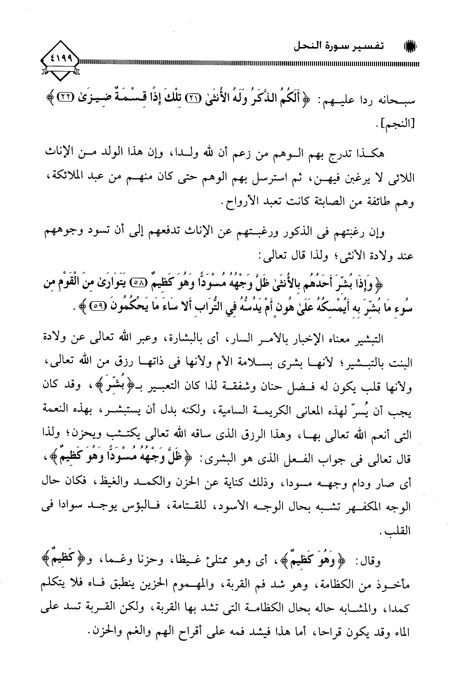 التبشير معناه الإخبار بالأمر السار، أي بالبشارة، وعبر اللَّه تعالى عن ولادة البنت بالتبشير؛ لأنها بشرى بسلامة الأم ولأنها في ذاتها رزق من اللَّه تعالى، ولأنها قلب يكون له فضل حنان وشفقة لذا كان التعبير بـ (بُشِّرَ)، وقد كان يجب أن يُسرَّ لهذه المعاني الكريمة السامية، ولكنه بدل أن يستبشر، بهذه النعمة التي أنعم اللَّه تعالى بها، وهذا الرزق الذي ساقه اللَّه تعالى يكتئب ويحزن؛ ولذا قال تعالى في جواب الفعل الذي هو البشرى: (ظَلَّ وَجْهُهُ مُسْوَدًا وَهُوَ كَظِيمٌ)، أي صار ودام وجهه مسودا، وذلك كناية عن الحزن والكمد والغيظ، فكان حال الوجه المكفهر تشبه بحال الوجه الأسود، للقتامة، فالبؤس يوجد سوادا في القلب.