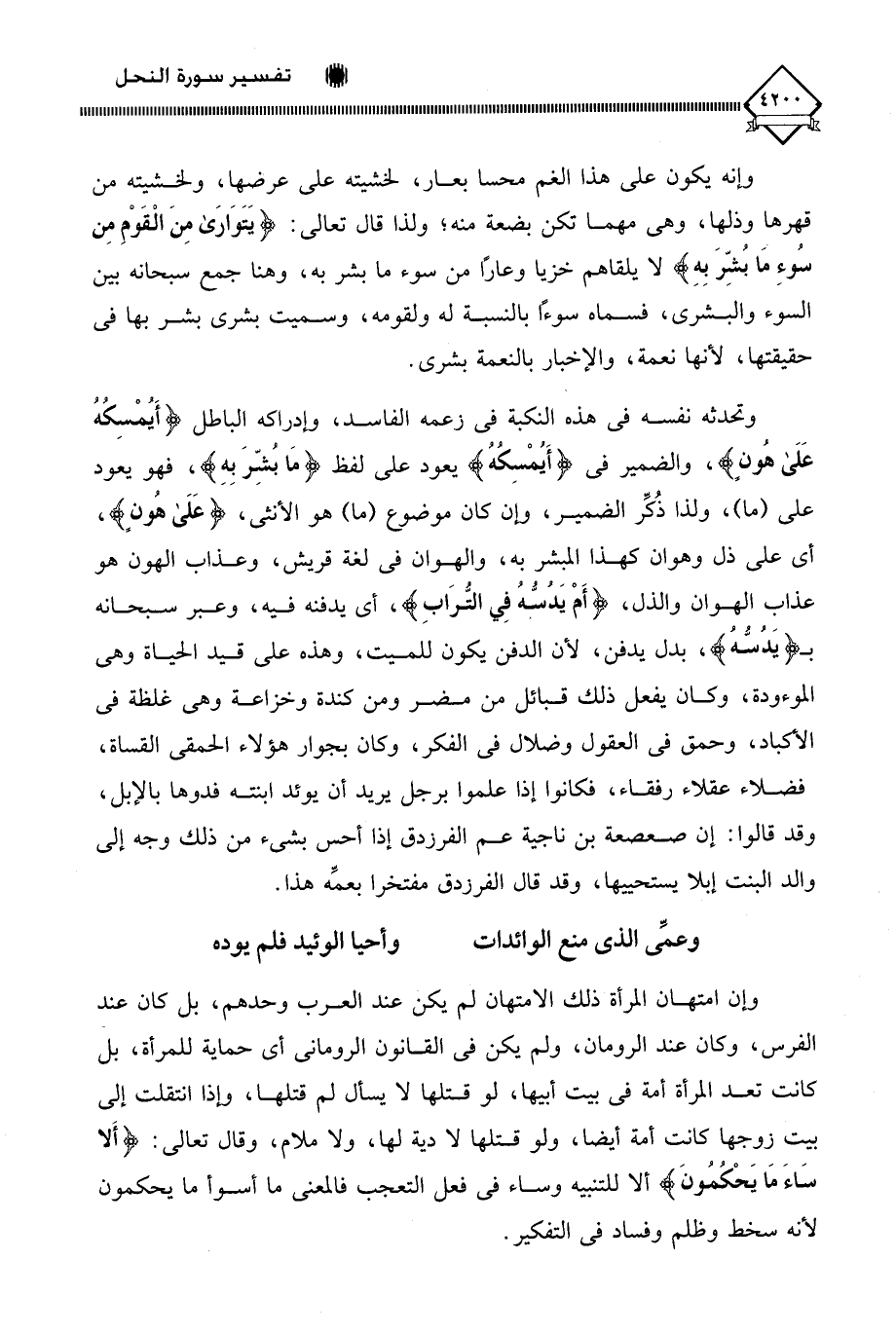 على (ما)، ولذا ذُكِّر الضمير، وإن كان موضوع (ما) هو الأنثى، (عَلَى هُون)، أي على ذل وهوان كهذا المبشر به، والهوان في لغة قريش، وعذاب الهون هو عذاب الهوان والذل، (أَمْ يَدُسُّهُ فِي التُّرَابِ)، أي يدفنه فيه، وعبر سبحانه بـ (يَدُسُّهُ)، بدل يدفن، لأن الدفن يكون للميت، وهذه على قيد الحياة وهي الموءودة، وكان يفعل ذلك قبائل من مضر ومن كندة وخزاعة وهي غلظة في الأكباد، وحمق في العقول وضلال في الفكر، وكان بجوار هؤلاء الحمقى القساة، فضلاء عقلاء رفقاء، فكانوا إذا علموا برجل يريد أن يوئد ابنته فدوها بالإبل، وقد قالوا: إن صعصعة بن ناجية عم الفرزدق إذا أحس بشيء من ذلك وجه إلى والد البنت إبلا يستحييها، وقد قال الفرزدق مفتخرا بعمَه هذا.