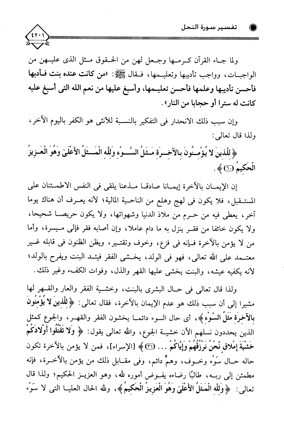ولذا قال تعالى في حال البشرى بالبنت، وخشية الفقر والعار والقهر لها مشيرا إلى أن سبب ذلك هو عدم الإيمان بالآخرة، فقال تعالى: (لِلَّذِين لَا يُؤْمِنونَ بِالآخِرَةِ مَثَلُ السَّوْءِ)، أي حال السوء دائما يخشون الفقر والقهر، والجوع كمثل الذين يحددون نسلهم الآن خشية الجوع، واللَّه تعالى يقول: (وَلَا تَقْتُلُوا أَوْلَادَكُمْ خَشْيَةَ إِمْلَاقٍ نَحْنُ نَرْزُقُهُمْ وَإِيَّاكُمْ. . .)، فمن لَا يؤمن بالآخرة تكون حاله حال سَوْء وخوف، وهمٍّ دائم، وفي مقابل ذلك من يؤمن بالآخرة، فإنه مطمئن إلى ربه، طالبًا رضاءه يفوض أموره للَّه، وهو العزيز الحكيم، ولذا قال تعالى: (وَلِلَّهِ الْمَثَلُ الأَعْلَى وَهُوَ الْعَزِيزُ الْحَكِيمُ)، وللَّه الحال العليا التي لَا سَوْء