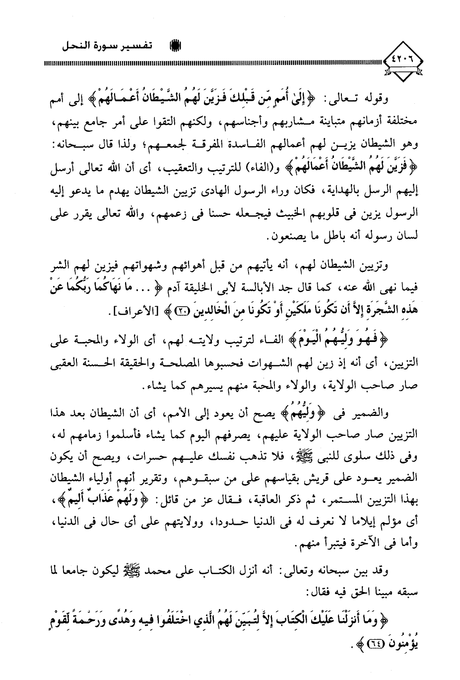 والضمير في (وَلِيهُمُ) يصح أن يعود إلى الأمم، أي أن الشيطان بعد هذا التزيين صار صاحب الولاية عليهم، يصرفهم اليوم كما يشاء فأسلموا زمامهم له، وفى ذلك سلوى للنبي - صلى الله عليه وسلم -، فلا تذهب نفسك عليهم حسرات، ويصح أن يكون الضمير يعود على قريش بقياسهم على من سبقوهم، وتقرير أنهم أولياء الشيطان بهذا التزيين المستمر، ثم ذكر العاقبة، فقال عز من قائل: (وَلَهُمْ عَذَابٌ أَلِيمٌ)، أي مؤلم إيلاما لَا نعرف له في الدنيا حدودا، وولايتهم على أي حال في الدنيا، وأما في الآخرة فيتبرأ منهم.