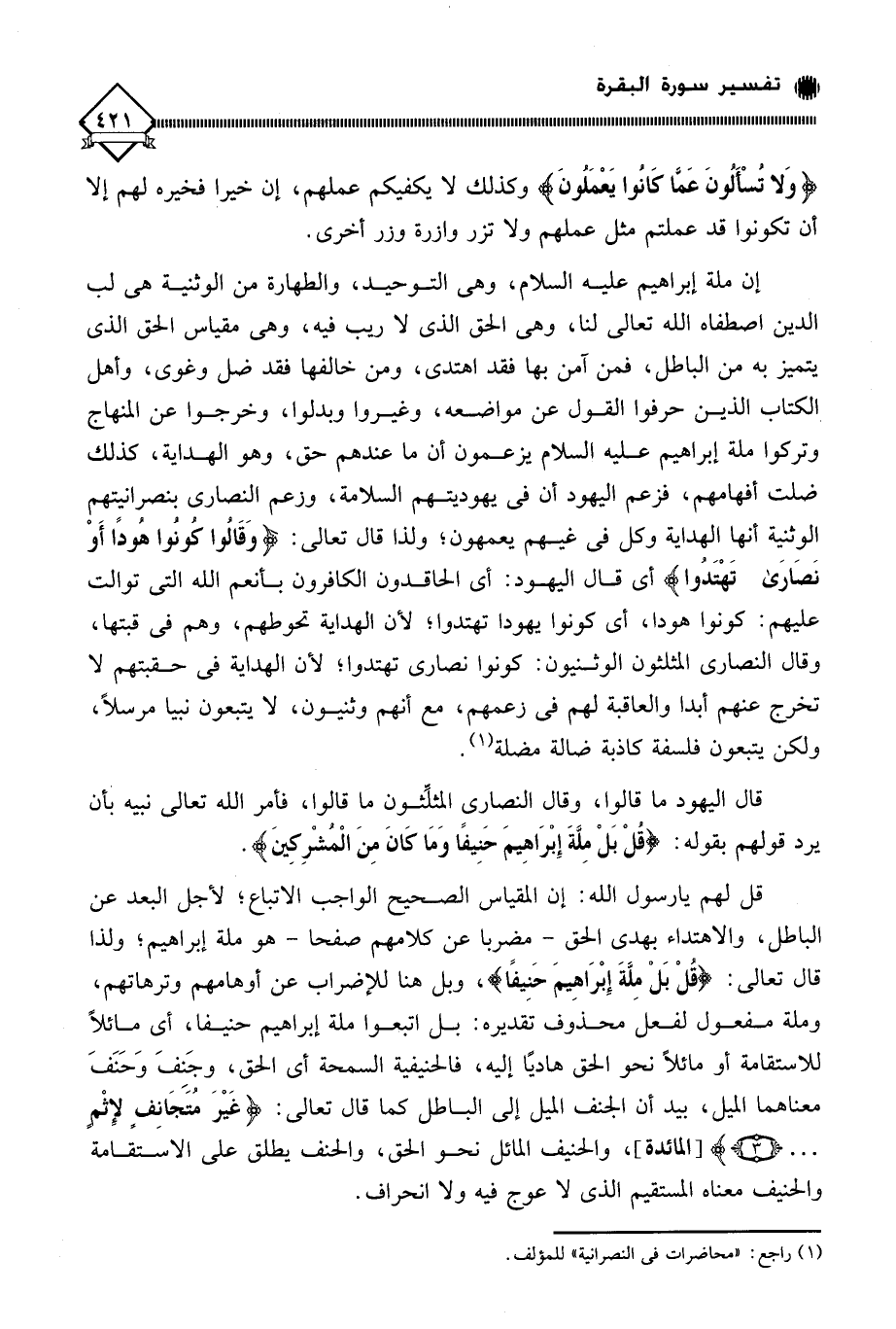 إن ملة إبراهيم عليه السلام، وهي التوحيد، والطهارة من الوثنية هي لب الدين اصطفاه الله تعالى لنا، وهي الحق الذي لَا ريب فيه، وهي مقياس الحق الذي يتميز به من الباطل، فمن آمن بها فقد اهتدى، ومن خالفها فقد ضل وغوى، وأهل الكتاب الذين حرفوا القول عن مواضعه، وغيروا وبدلوا، وخرجوا عن المنهاج وتركوا ملة إبراهيم عليه السلام يزعمون أن ما عندهم حق، وهو الهداية، كذلك ضلت أفهامهم، فزعم اليهود أن في يهوديتهم السلامة، وزعم النصارى بنصرانيتهم الوثنية أنها الهداية وكل في غيهم يعمهون، ولذا قال تعالى: