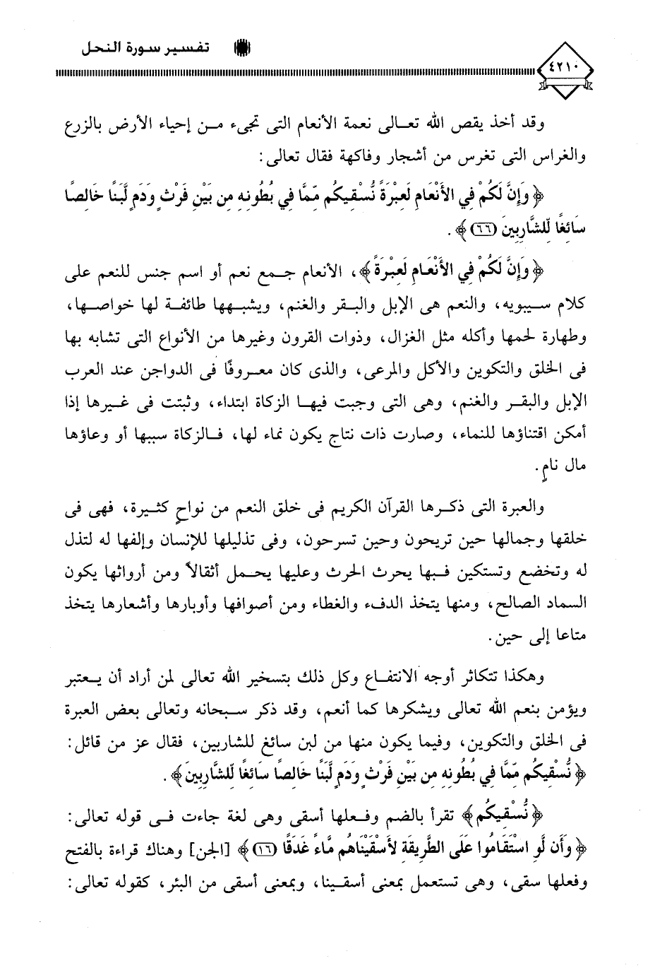 (وَإِنَّ لَكُمْ فِي الأَنْعَامِ لَعِبْرَةً)، الأنعام جمع نعم أو اسم جنس للنعم على كلام سيبويه، والنعم هي الإبل والبقر والغنم، ويشبهها طائفة لها خواصها، وطهارة لحمها وأكله مثل الغزال، وذوات القرون وغيرها من الأنواع التي تشابه بها في الخلق والتكوين والأكل والمرعى، والذي كان معروفًا فى الدواجن عند العرب الإبل والبقر والغنم، وهي التي وجبت فيها الزكاة ابتداء، وثبتت في غيرها إذا أمكن اقتناؤها للنماء، وصارت ذات نتاج يكون نماء لها، فالزكاة سببها أو وعاؤها مال نامٍ.
