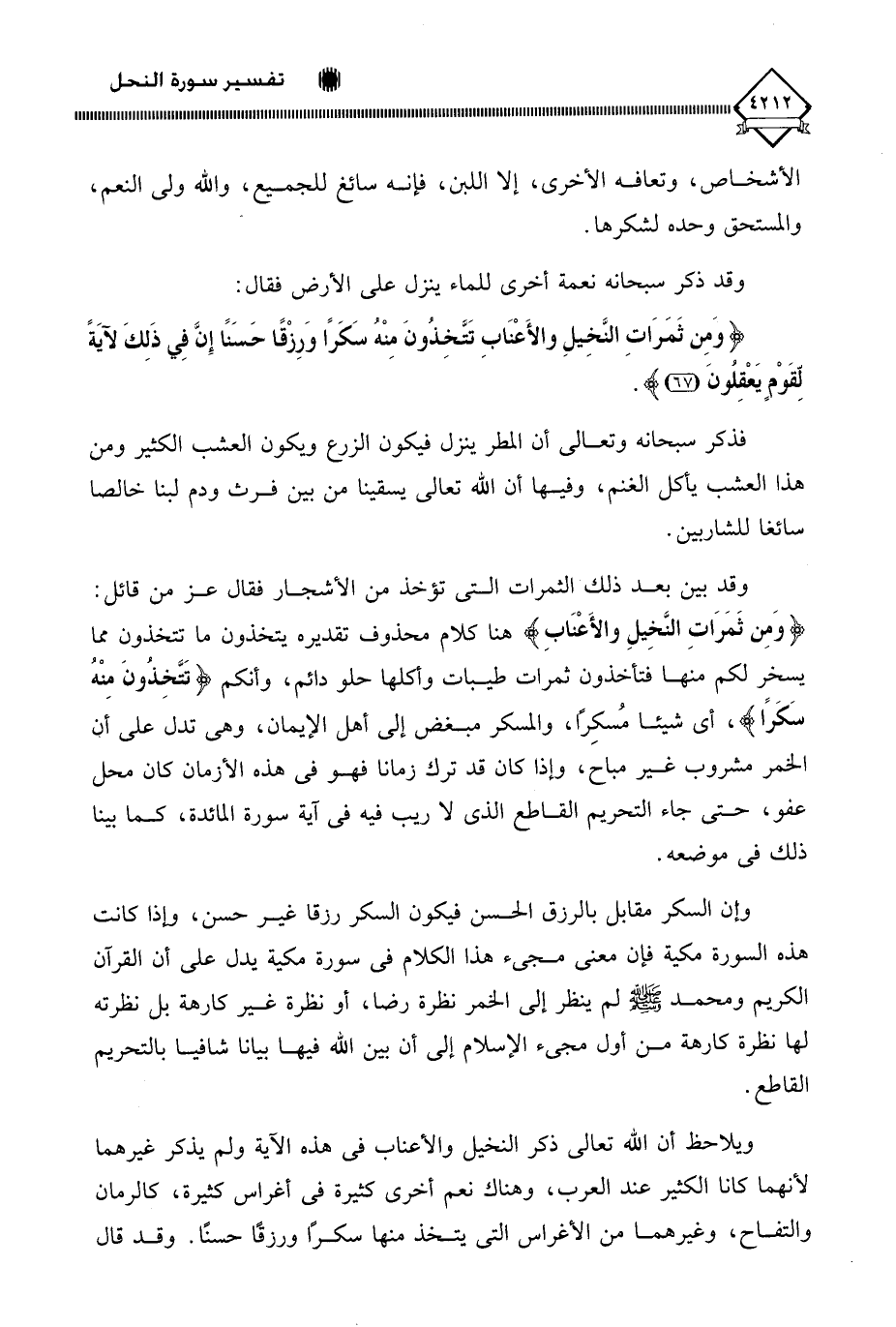 (وَمِن ثَمَرَاتِ النَّخِيلِ والأَعْنَابِ) هنا كلام محذوف تقديره يتخذون ما تتخذون مما يسخر لكم منها فتأخذون ثمرات طيبات وأكلها حلو دائم، وأنكم تتخذُونَ مِنهُ سَكَرًا، أي شيئا مُسكِرًا، والمسكر مبغض إلى أهل الإيمان، وهي تدل على أن الخمر مشروب غير مباح، وإذا كان قد ترك زمانا فهو في هذه الأزمان كان محل عفو، حتى جاء التحريم القاطع الذي لَا ريب فيه في آية سورة المائدة، كما بينا ذلك في موضعه.