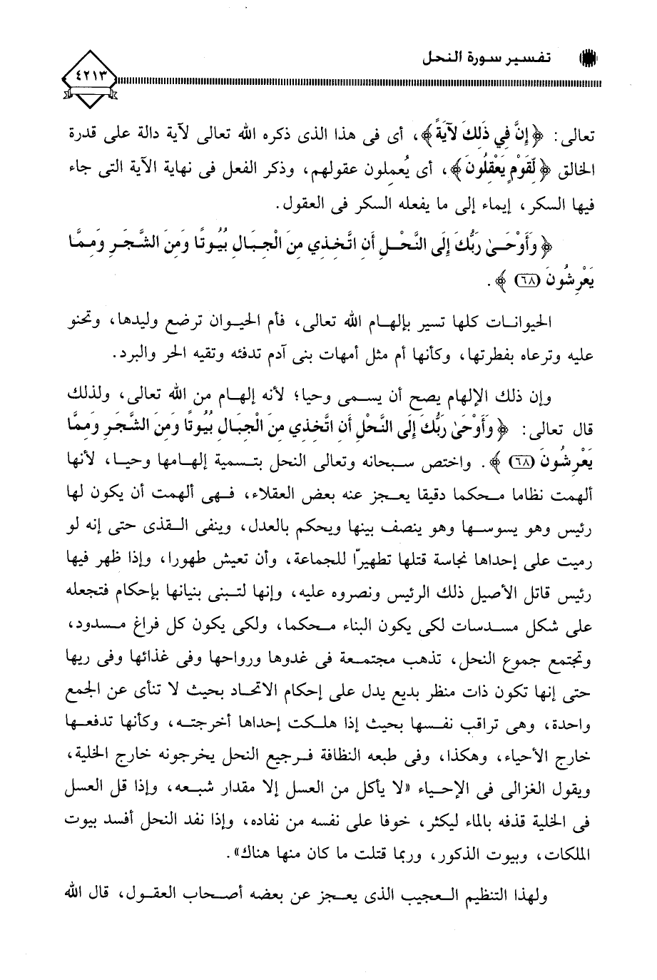 واختص سبحانه وتعالى النحل بتسمية إلهامها وحيا، لأنها ألهمت نظاما محكما دقيقا يعجز عنه بعض العقلاء، فهي ألهمت أن يكون لها رئيس وهو يسوسها وهو ينصف بينها ويحكم بالعدل، وينفي القذى حتى إنه لو رميت على إحداها نجاسة قتلها تطهيرًا للجماعة، وأن تعيش طهورا، وإذا ظهر فيها رئيس قاتل الأصيل ذلك الرئيس ونصروه عليه، وإنها لتبني بنيانها بإحكام فتجعله على شكل مسدسات لكي يكون البناء محكما، ولكي يكون كل فراغ مسدود، وتجتمع جموع النحل، تذهب مجتمعة في غدوها ورواحها وفي غذائها وفي ريها حتى إنها تكون ذات منظر بديع يدل على إحكام الاتحاد بحيث لَا تنأى عن الجمع واحدة، وهي تراقب نفسها بحيث إذا هلكت إحداها أخرجته، وكأنها تدفعها خارج الأحياء، وهكذا، وفي طبعه النظافة فرجيع النحل يخرجونه خارج الخلية، ويقول الغزالي في الإحياء " لا يأكل من العسل إلا مقدار شبعه، وإذا قل العسل في الخلية قذفه بالماء ليكثر، خوفا على نفسه من نفاده، وإذا نفد النحل أفسد بيوت الملكات، وبيوت الذكور، وربما قتلت ما كان منها هناك ".