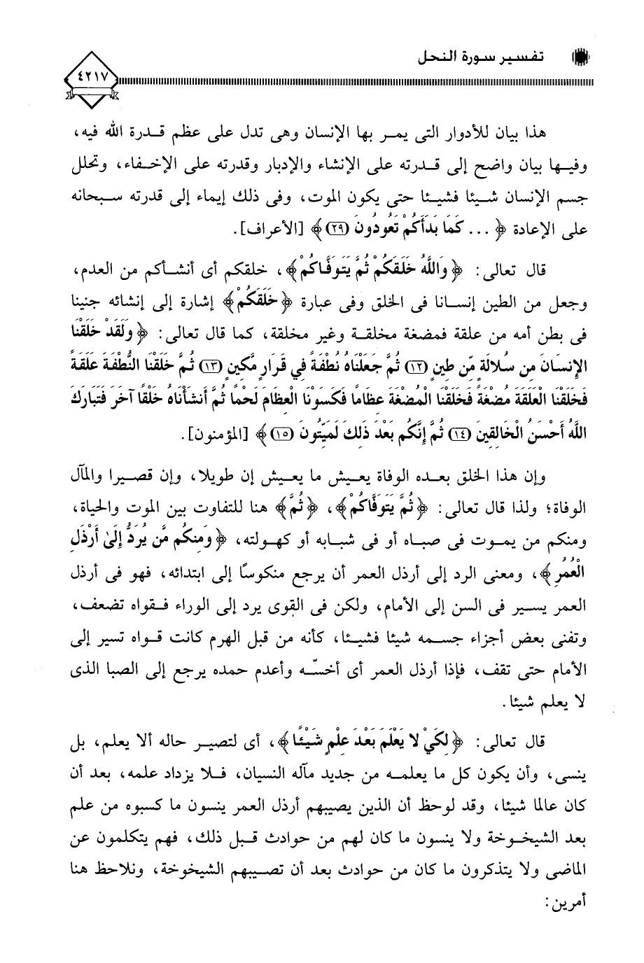 هذا بيان للأدوار التي يمر بها الإنسان وهي تدل على عظم قدرة اللَّه فيه، وفيها بيان واضح إلى قدرته على الإنشاء والإدبار وقدرته على الإخفاء، وتحلل جسم الإنسان شيئا فشيئا حتى يكون الموت، وفي ذلك إيماء إلى قدرته سبحانه على الإعادة (. . . كَمَا بَدَأَكُمْ تَعُودُونَ).