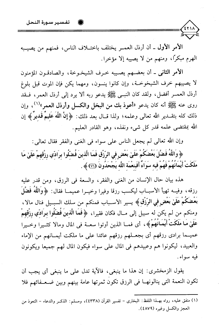 (وَاللَّهُ فَضَّلَ بَعْضَكُمْ عَلَى بَعْضٍ فِي الرِّزْقِ فَمَا الَّذِينَ فُضِّلُوا بِرَادِّي رِزْقِهِمْ عَلَى مَا مَلَكَتْ أَيْمَانُهُمْ فَهُمْ فِيهِ سَوَاءٌ أَفَبِنِعْمَةِ اللَّهِ يَجْحَدُونَ (71) هذه بيان حال الإنسان من الغنى والفقر، والسعة في الرزق، ومن قدر عليه رزقه، وفيه تهيأ الأسباب ليكسب رزقا وفيرا وخيرا عميما فقال: (وَاللَّهُ فَضَّلَ بَعْضَكُمْ عَلَى بَعْضٍ فِي الرِّزْقِ) يسير الأسباب فمنكم من سلك السبيل فنال مالا، ومنكم من لم يكن له سبيل إلى مال فكان فقيرا، (فَمَا الَّذِينَ فُضِّلُوا بِرَادِّي رِزْقِهِمْ عَلَى مَا مَلَكَتْ أَيْمَانُهُمْ)، أي فما الذين أوتوا سعة في المال ومالا كثيرا وخيرا عميما بِرَادِّي رِزْقِهِمْ أي بجعلهم رزقهم عائدا على ما ملكت أيمانهم من الإماء والعبيد، ليكونوا هم وعبيدهم في المال على سواء فيكون المال لهم جميعا ويكونون فيه سواء.