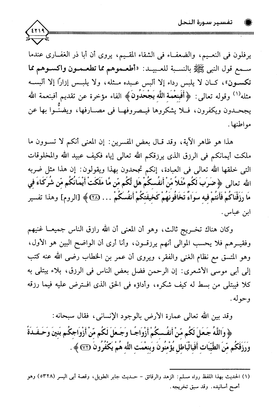 يرفلون في النعيم، والضعفاء في الشقاء المقيم، يروى أن أبا ذر الغفارى عندما سمع قول النبي - صلى الله عليه وسلم - بالنسبة للعبيد: " أطعموهم مما تطعمون واكسوهم مما تكسون "، كان لَا يلبس رداء إلا ألبس عبده مثله، ولا يلبس إزارًا إلا ألبسه مثله (¬1) وقوله تعالى: (أَفَبِنِعْمَةِ اللَّهِ يَجْحَدُونَ) الفاء مؤخرة عن تقديم أفبنعمة اللَّه يجحدون ويكفرون، فلا يشكروها فيصروفها في مصارفها، ويضنوا بها عن مواطنها.