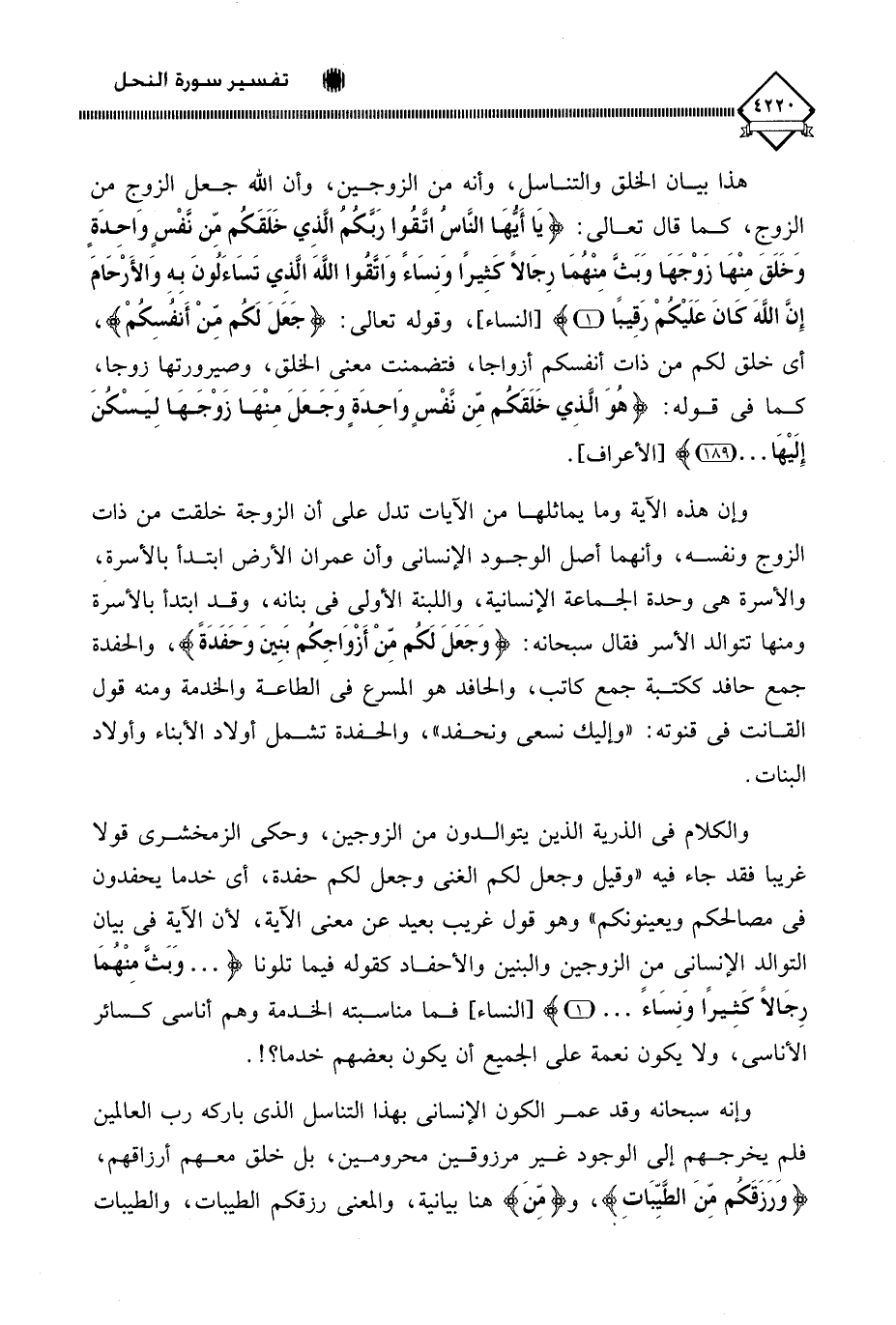 وإن هذه الآية وما يماثلها من الآيات تدل على أن الزوجة خلقت من ذات الزوج ونفسه، وأنهما أصل الوجود الإنساني وأن عمران الأرض ابتدأ بالأسرة، والأسرة هي وحدة الجماعة الإنسانية، واللبنة الأولى في بنانه، وقد ابتدأ بالأسرة ومنها تتوالد الأسر فقال سبحانه: (وَجَعَلَ لَكُم مِّنْ أَزْوَاجِكُم بَنِينَ وَحَفَدَةً)، والحفدة جمع حافد ككتبة جمع كاتب، والحافد هو المسرع في الطاعة والخدمة ومنه قول القانت في قنوته: " وإليك نسعى ونحفد "، والحفدة تشمل أولاد الأبناء وأولاد البنات.