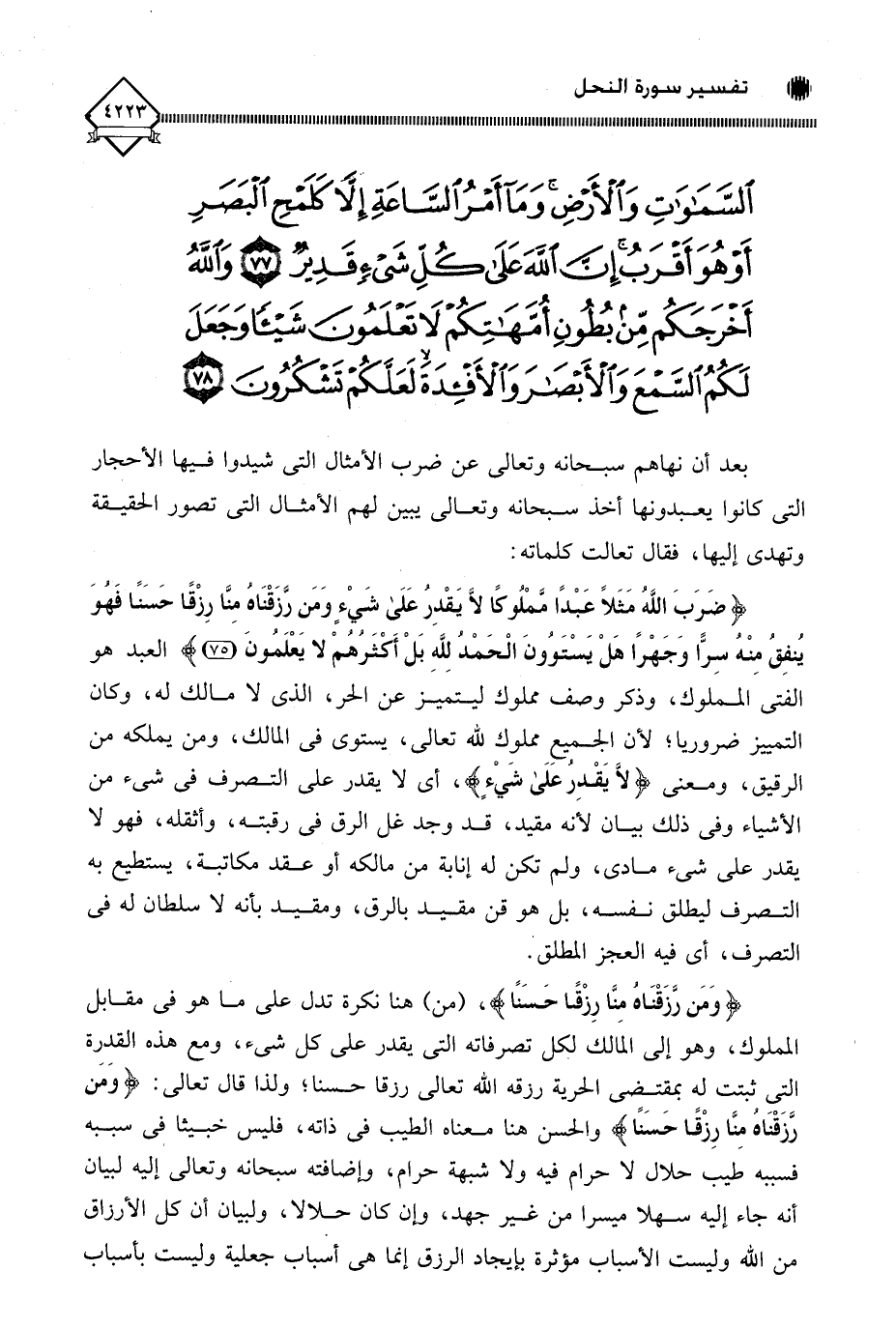 (ضَرَبَ اللَّهُ مَثَلًا عَبْدًا مَمْلُوكًا لَا يَقْدِرُ عَلَى شَيْءٍ وَمَنْ رَزَقْنَاهُ مِنَّا رِزْقًا حَسَنًا فَهُوَ يُنْفِقُ مِنْهُ سِرًّا وَجَهْرًا هَلْ يَسْتَوُونَ الْحَمْدُ لِلَّهِ بَلْ أَكْثَرُهُمْ لَا يَعْلَمُونَ (75)