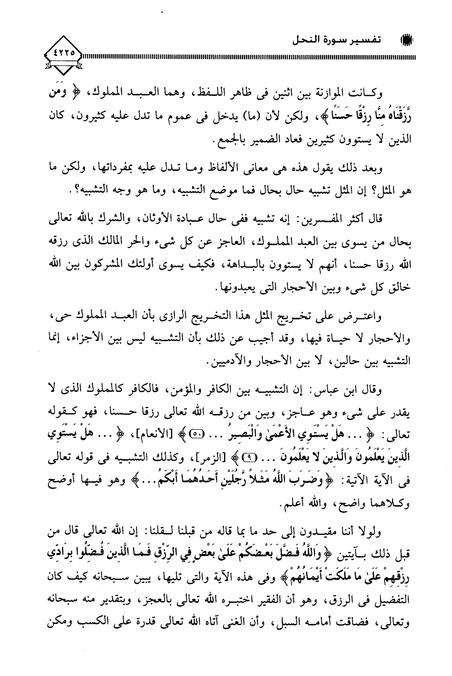 قال أكثر المفسرين: إنه تشبيه ففي حال عبادة الأوثان، والشرك باللَّه تعالى بحال من يسوي بين العبد المملوك، العاجز عن كل شيء والحر المالك الذي رزقه اللَّه رزقا حسنا، أنهم لَا يستوون بالبداهة، فكيف يسوي أولئك المشركون بين اللَّه خالق كل شيء وبين الأحجار التي يعبدونها.