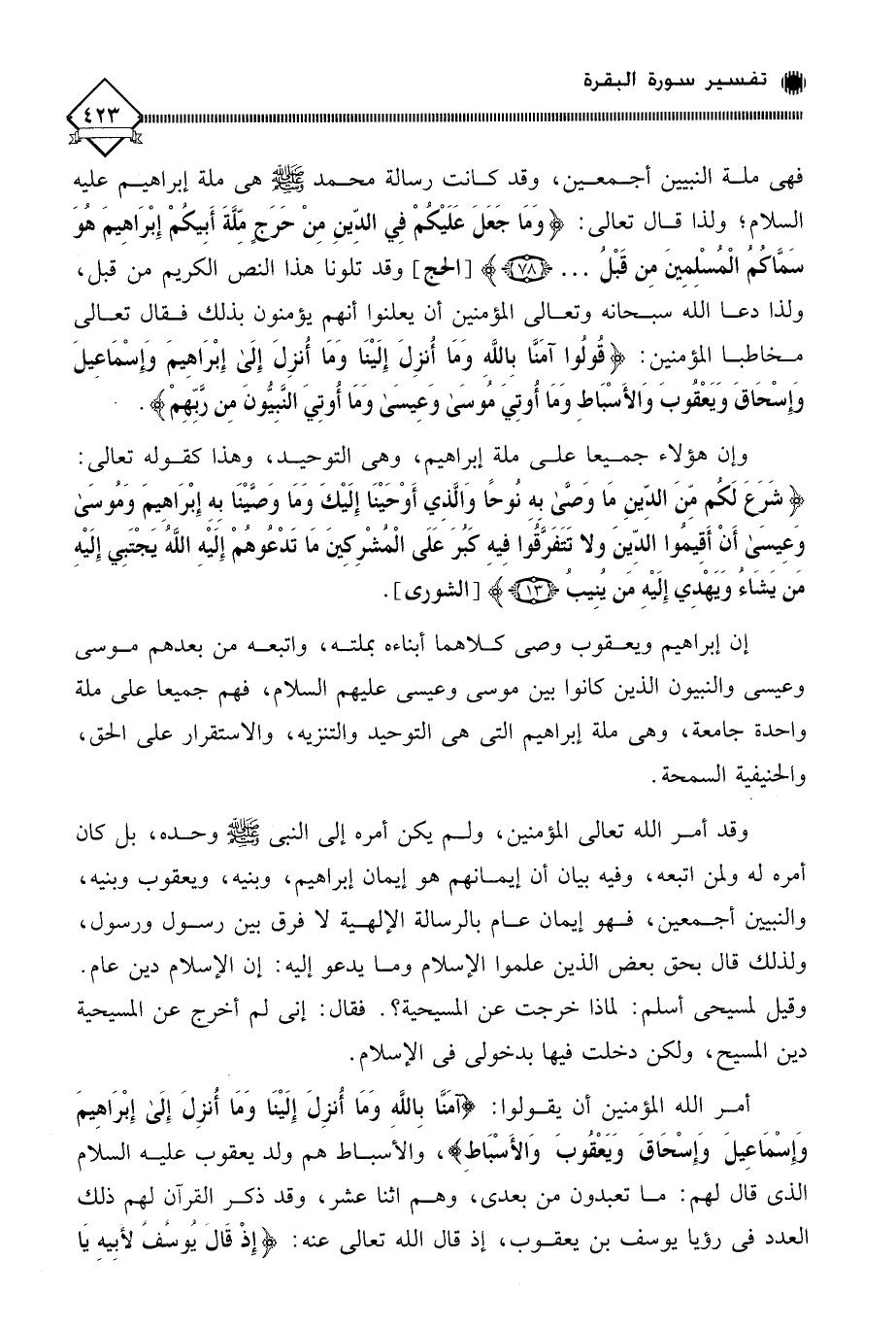 فهي ملة النبيين أجمعين، وقد كانت رسالة محمد - صلى الله عليه وسلم - هي ملة إبراهيم عليه السلام! ولذا قال تعالى: (وَمَا جَعَلَ عَلَيْكُمْ فِي الدِّينِ مِنْ حَرَجِ مِّلَّةَ أَبِيكُمْ إِبْرَاهِيمَ هُوَ سَمَّاكُم الْمُسْلِمِينَ مِن قَبْلُ. . .)، وقد تلونا هذا النص الكريم من قبل، ولذا دعا الله سبحانه وتعالى المؤمنين أن يعلنوا أنهم يؤمنون بذلك فقال تعالى مخاطبا المؤمنين: