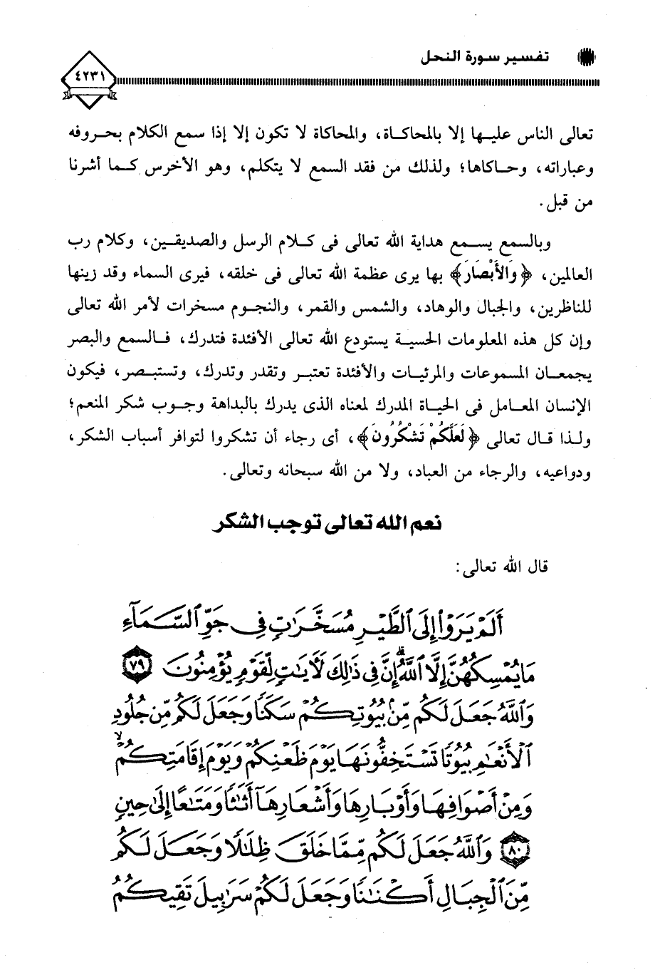 (أَلَمْ يَرَوْا إِلَى الطَّيْرِ مُسَخَّرَاتٍ فِي جَوِّ السَّمَاءِ مَا يُمْسِكُهُنَّ إِلَّا اللَّهُ إِنَّ فِي ذَلِكَ لَآيَاتٍ لِقَوْمٍ يُؤْمِنُونَ (79) وَاللَّهُ جَعَلَ لَكُمْ مِنْ بُيُوتِكُمْ سَكَنًا وَجَعَلَ لَكُمْ مِنْ جُلُودِ الْأَنْعَامِ بُيُوتًا تَسْتَخِفُّونَهَا يَوْمَ ظَعْنِكُمْ وَيَوْمَ إِقَامَتِكُمْ وَمِنْ أَصْوَافِهَا وَأَوْبَارِهَا وَأَشْعَارِهَا أَثَاثًا وَمَتَاعًا إِلَى حِينٍ (80) وَاللَّهُ جَعَلَ لَكُمْ مِمَّا خَلَقَ ظِلَالًا وَجَعَلَ لَكُمْ مِنَ الْجِبَالِ أَكْنَانًا وَجَعَلَ لَكُمْ سَرَابِيلَ تَقِيكُمُ
