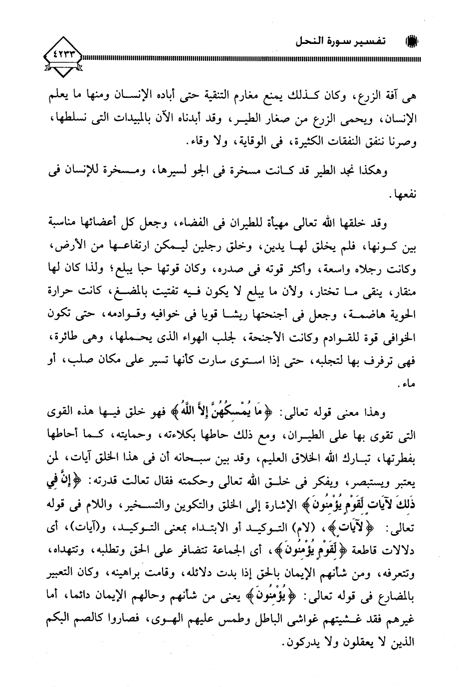 وهذا معنى قوله تعالى: (مَا يُمْسِكُهنَّ إِلَّا اللَّهُ) فهو خلق فيها هذه القوى التي تقوى بها على الطيران، ومع ذلك حاطها بكلاءته، وحمايته، كما أحاطها بفطرتها، تبارك الله الخلاق العليم، وقد بين سبحانه أن في هذا الخلق آيات، لمن يعتبر ويستبصر، ويفكر في خلق اللَّه تعالى وحكمته فقال تعالت قدرته: (إِن فِي ذَلِكَ لآيَات لِّقَوْم يُؤْمنُونَ) الإشارة إلى الخلق والتكوين والتسخير، واللام في قوله تعالى: (لآيَاتٍ)، (لام) التوكيد أو الابتداء بمعنى التوكيد، و (آيات)، أي دلالات قاطعة (لِّقَوْم يُؤْمِنونَ)، أي الجماعة تتضافر على الحق وتطلبه، وتتهداه، وتتعرفه، ومن شأنهم الإيمان بالحق إذا بدت دلائله، وقامت براهينه، وكان التعبير بالمضارع في قوله تعالى: (يُؤْمِنونَ) يعني من شأنهم وحالهم الإيمان دائما، أما غيرهم فقد غشيتهم غواشي الباطل وطمس عليهم الهوى، فصاروا كالصم البكم الذين لَا يعقلون ولا يدركون.