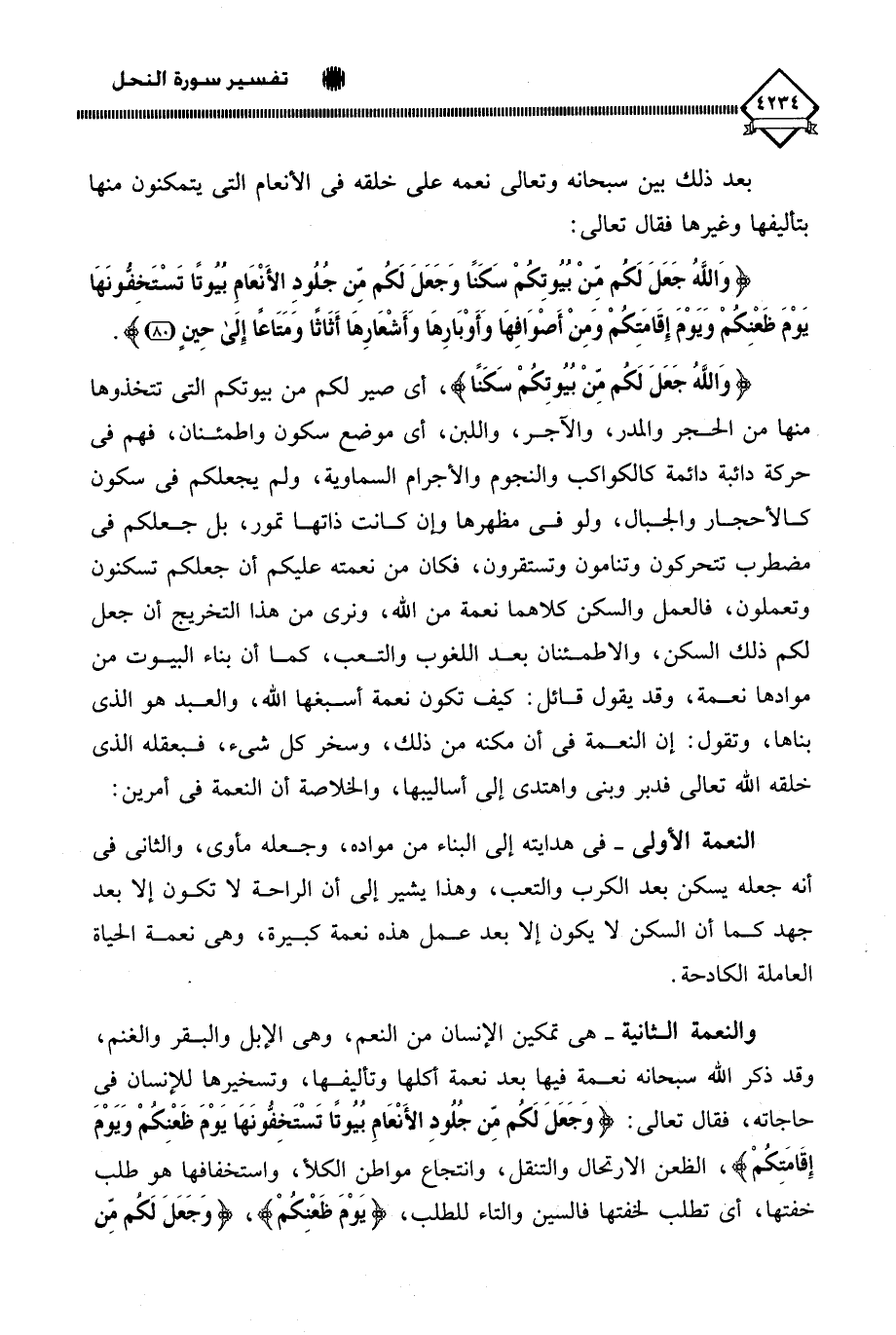 والنعمة الثانية - هي تمكين الإنسان من النعم، وهي الإبل والبقر والغنم، وقد ذكر اللَّه سبحانه نعمة فيها بعد نعمة أكلها وتأليفها، وتسخيرها للإنسان في حاجاته، فقال تعالى: (وَجَعَلَ لَكُم مِّن جُلُودِ الأَنْعَامِ بُيُوتًا تَسْتَخِفُّونَهَا يوْمَ ظَعْنِكُمْ وَيَوْم إِقَامَتِكُمْ)، الظعن الارتحال والتنقل، وانتجاع مواطنِ الكلأ، واستخفافها هو طلب خفتها، أي تطلب لخفتها فالسين والتاء للطلب، (يوْمَ ظَعْنِكُمْ)، (وَجَعَلَ لَكُم مِّن