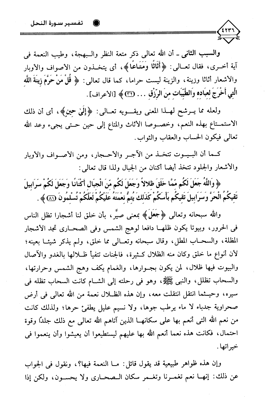 والسبب الثاني - أن اللَّه تعالى ذكر متعة النظر والبهجة، وطيب النعمة في آية أخرى، فقال تعالى: (أَثَاثًا وَمَتَاعًا)، أي يتخذون من الأصواف والأوبار والأشعار أثاثا وزينة، والزينة ليست حراما، كما قال تعالى: (قُلْ مَنْ حَرَّمَ زِينَةَ اللَّهِ الَتِي أَخْرَجَ لِعِبَادِهِ وَالطَّيِّبَاتِ مِنَ الرِّزْقِ. . .).