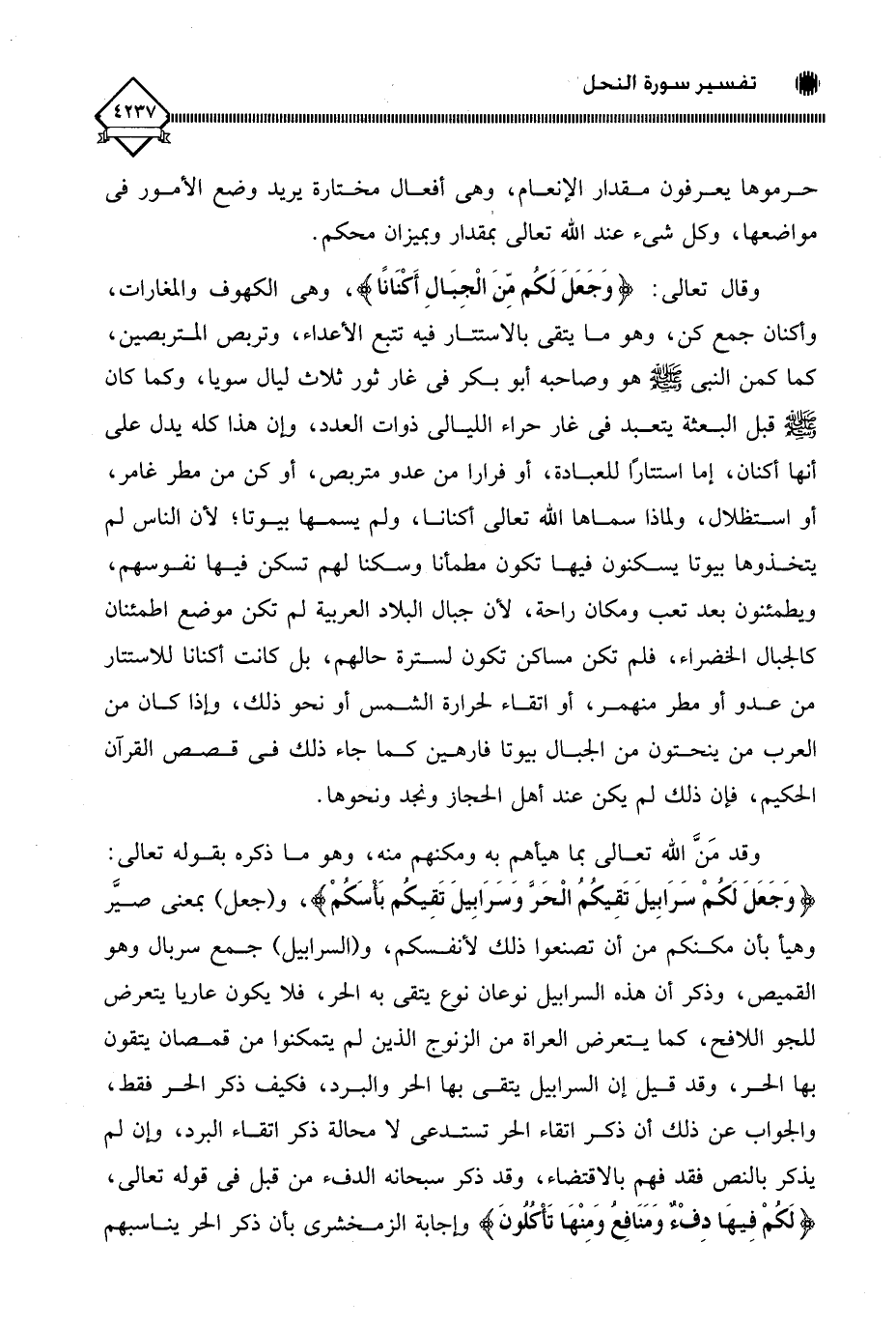 وقال تعالى: (وَجَعَلَ لَكُم مِّنَ الْجِبَالِ أَكنَانًا)، وهي الكهوف والمغارات، وأكنان جمع كن، وهو ما يتقى بالاستتار فيه تتبع الأعداء، وتربص المتربصين، كما كمن النبي - صلى الله عليه وسلم - هو وصاحبه أبو بكر في غار ثور ثلاث ليال سويا، وكما كان - صلى الله عليه وسلم - قبل البعثة يتعبد في غار حراء الليالي ذوات العدد، وإن هذا كله يدل على أنها أكنان، إما استتارًا للعبادة، أو فرارا من عدو متربص، أو كن من مطر غامر، أو استظلال، ولماذا سماها اللَّه تعالى أكنانا، ولم يسمها بيوتا؛ لأن الناس لم يتخذوها بيوتا يسكنون فيها تكون مطمأنا وسكنا لهم تسكن فيها نفوسهم، ويطمئنون بعد تعب ومكان راحة، لأن جبال البلاد العربية لم تكن موضع اطمئنان كالجبال الخضراء، فلم تكن مساكن تكون لسترة حالهم، بل كانت أكنانا للاستتار من عدو أو مطر منهمر، أو اتقاء لحرارة الشمس أو نحو ذلك، وإذا كان من العرب من ينحتون من الجبال بيوتا فارهين كما جاء ذلك في قصص القرآن الحكيم، فإن ذلك لم يكن عند أهل الحجاز ونجد ونحوها.