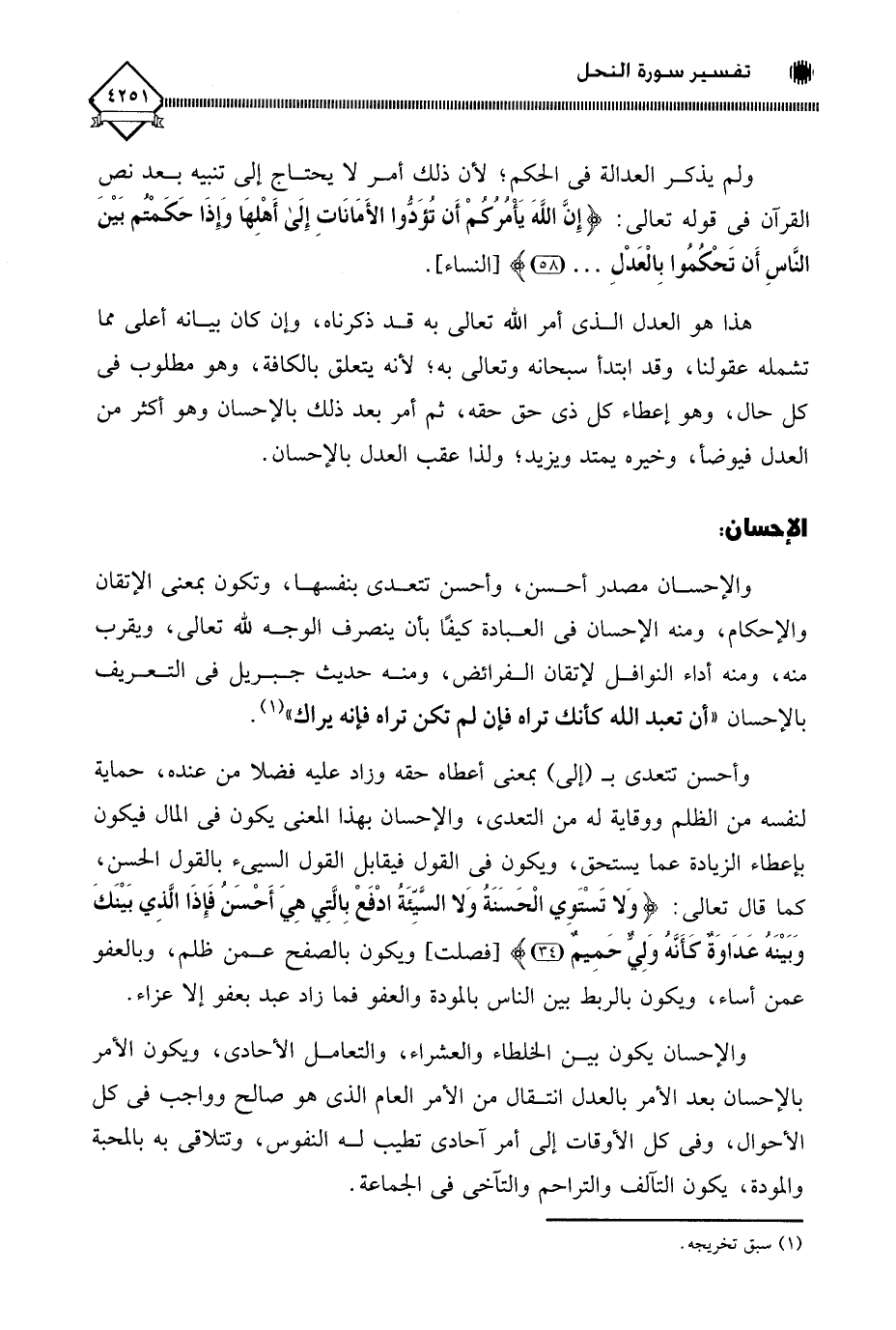 هذا هو العدلى الذي أمر اللَّه تعالى به قد ذكرناه، وإن كان بيانه أعلى مما تشمله عقولنا، وقد ابتدأ سبحانه وتعالى به؛ لأنه يتعلق بالكافة، وهو مطلوب في كل حال، وهو إعطاء كل ذي حق حقه، ثم أمر بعد ذلك بالإحسان وهو أكثر من العدل فيوضأ، وخيره يمتد ويزيد؛ ولذا عقب العدل بالإحسان.