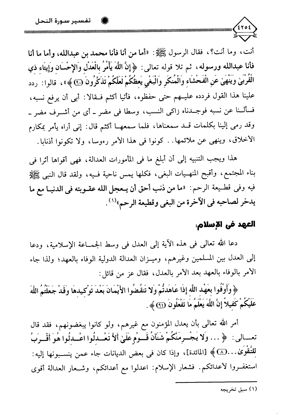 أن)، وما أنت؟، فقال الرسول - صلى الله عليه وسلم -: " أما من أنا فأنا محمد بن عبد الله، وأما ما أنا فأنا عبد الله ورسوله، ثم تلا قوله تعالى: (إِنَّ اللَّهَ يَأْمُرُ بِالْعَدْلِ وَالْإِحْسَانِ وَإِيتَاءِ ذِي الْقُرْبَى وَيَنْهَى عَنِ الْفَحْشَاءِ وَالْمُنْكَرِ وَالْبَغْيِ يَعِظُكُمْ لَعَلَّكُمْ تَذَكَّرُونَ) "، قالوا: ردد علينا هذا القول فردده عليهم حتى حفظوه، فأتيا أكثم فقالا: أبى أن يرفع نسبه، فسألنا عن نسبه فوجدناه زاكي النسب، وسطا في مضر - أي من أشرف مضر - وقد رمى إلينا بكلمات قد سمعناها، فلما سمعها أكثم قال: إني أراه يأمر بمكارم الأخلاق، وينهى عن ملائمها. . كونوا في هذا الأمر رءوسا، ولا تكونوا أذنابا.