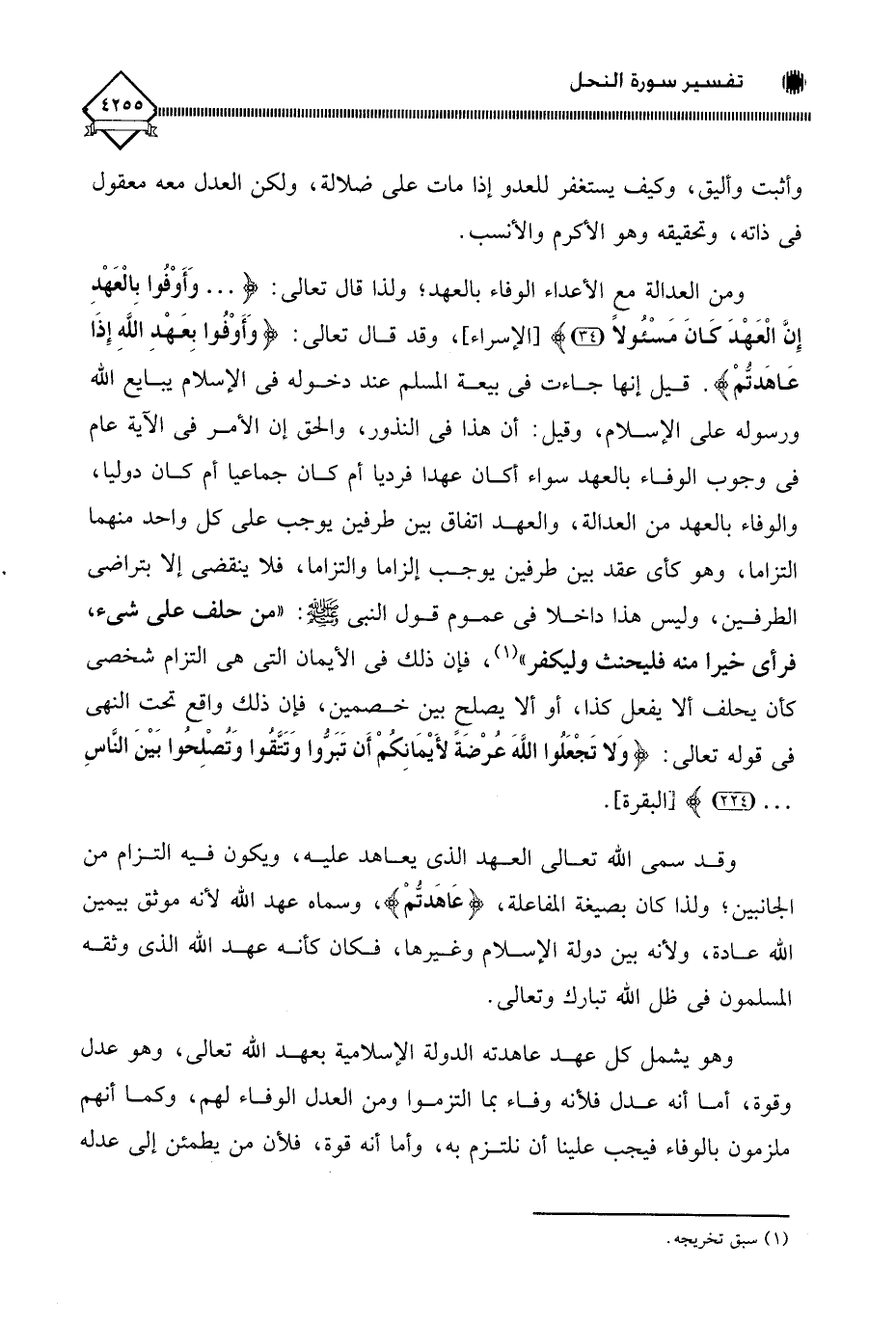 ومن العدالة مع الأعداء الوفاء بالعهد؛ ولذا قال تعالى: (. . . وَأَوْفُوا بِالعَهْدِ إِنَّ الْعَهْدَ كَانَ مَسْئُولًا)، وقد قال تعالى: (وَأَوْفُوا بِعَهْدِ اللَّهِ إِذَا عَاهَدتُّمْ). قيل إنها جاءت في بيعة المسلم عند دخوله في الإسلام يبايع اللَّه ورسوله على الإسلام، وقيل: إن هذا في النذور، والحق إن الأمر في الآية عام في وجوب الوفاء بالعهد سواء أكان عهدا فرديا أم كان جماعيا أم كان دوليا، والوفاء بالعهد من العدالة، والعهد اتفاق بين طرفين يوجب على كل واحد منهما التزاما، وهو كأي عقد بين طرفين يوجب إلزاما والتزاما، فلا ينقضي إلا بتراضي الطرفين، وليس هذا داخلا في عموم قول النبي - صلى الله عليه وسلم -: " من حلف على شيء، فرأى خيرا منه فليحنث وليكفر " (¬1)، فإن ذلك في الأيمان التي هي التزام شخصي كان يحلف ألا يفعل كذا، أو ألا يصلح بين خصمين، فإن ذلك واقع تحت النهي في قوله تعالى: (وَلا تَجْعَلُوا اللَّهَ عُرْضةَ لأَيْمَانِكُمْ أَن تَبَرُّوا وَتَتَّقُوا وَتُصْلِحُوا بَيْنَ النَّاسِ. . .).