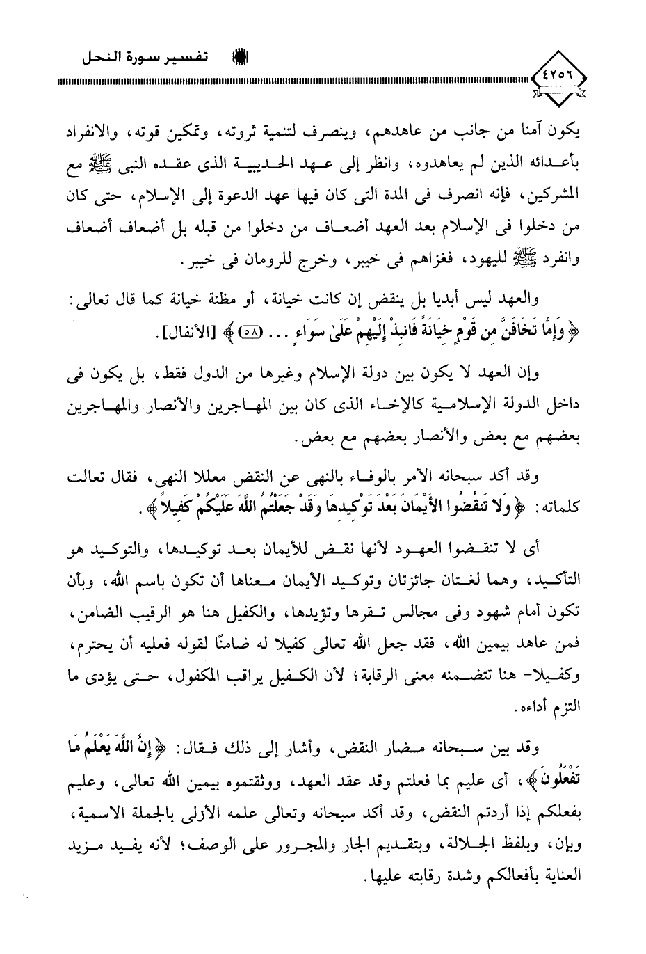 أي لَا تنقضوا العهود لأنها نقض للأيمان بعد توكيدها، والتوكيد هو التأكيد، وهما لغتان جائزتان وتوكيد الأيمان معناها أن تكون باسم اللَّه، وبأن تكون أمام شهود وفي مجالس تقرها وتؤيدها، والكفيل هنا هو الرقيب الضامن، فمن عاهد بيمين اللَّه، فقد جعل اللَّه تعالى كفيلا له ضامنًا لقوله فعليه أن يحترم، وكفيلا - هنا تتضمنه معنى الرقابة؛ لأن الكفيل يراقب المكفول، حتى يؤدي ما التزم أداءه.
