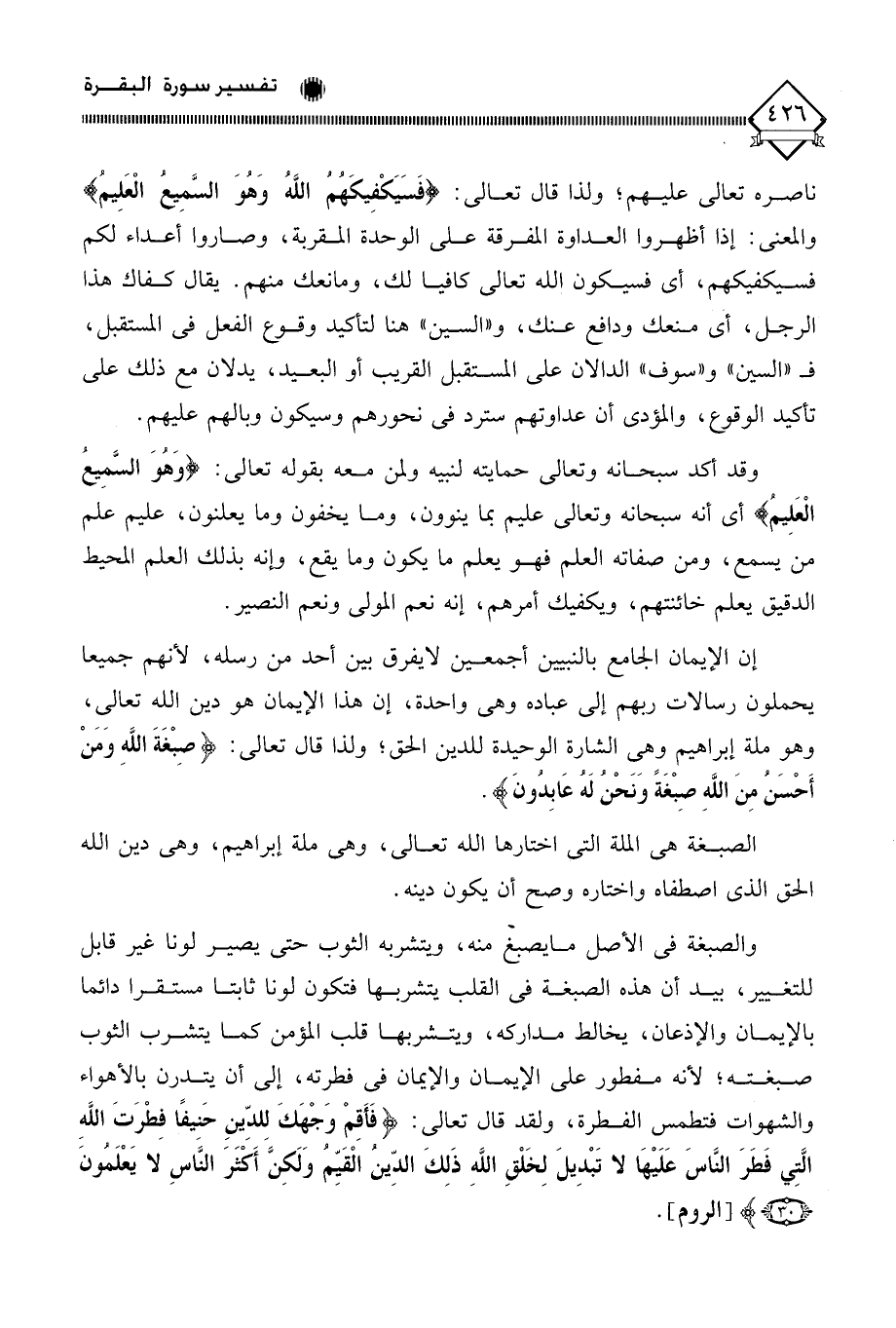 ناصره تعالى عليهم؛ ولذا قال تعالى: (فَسَيَكْفِيكَهُمُ اللَّهُ وَهُوَ السَّمِيعُ الْعَلِيمُ) والمعنى: إذا أظهروا العداوة المفرقة على الوحدة المقربة، وصاروا أعداء لكم فسيكفيكهم، أي فسيكون الله تعالى كافيا لك، ومانعك منهم. يقال كفاك هذا الرجل، أي منعك ودافع عنك، و " السين " هنا لتأكيد وقوع الفعل في المستقبل، فـ " السين " و " سوف " الدالان على المستقبل القريب أو البعيد، يدلان مع ذلك على تأكيد الوقوع، والمؤدى أن عداوتهم سترد في نحورهم وسيكون وبالهم عليهم.