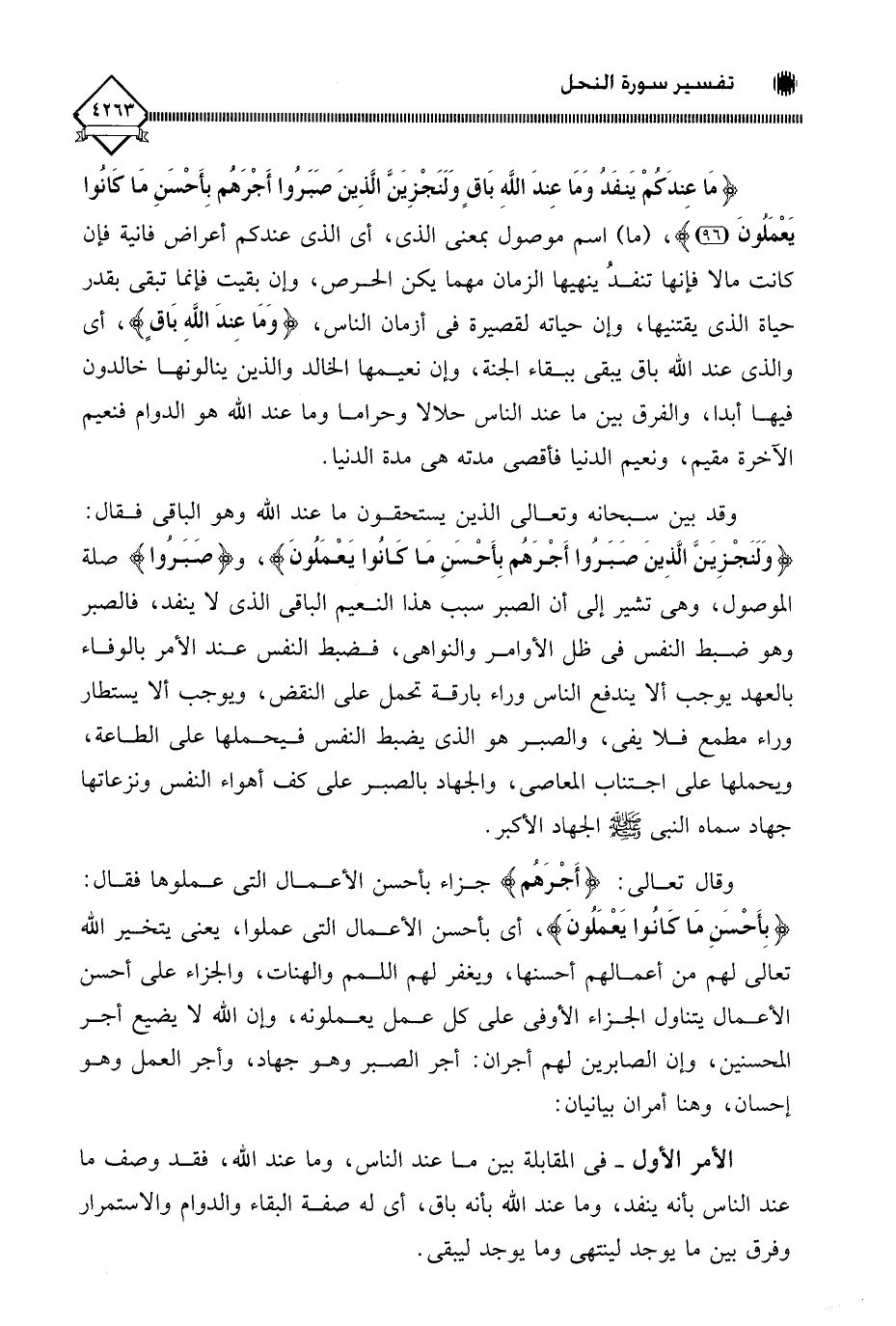 (وَلَنَجْزِيَنَّ الَّذِينَ صَبَرُوا أَجْرَهُم بِأَحْسنِ مَا كَانُوا يَعْمَلُونَ)، و (صَبَرُوا) صلة الموصول، وهي تشير إلى أن الصبر سبب هذا النعيم الباقي الذي لَا ينفد، فالصبر وهو ضبط النفس في ظل الأوامر والنواهي، فضبط النفس عند الأمر بالوفاء بالعهد يوجب ألا يتدفع الناس وراء بارقة تحمل على النقض، ويوجب ألا يستطار وراء مطمع فلا يفي، والصبر هو الذي يضبط النفس فيحملها على الطاعة، ويحملها على اجتناب المعاصي، والجهاد بالصبر على كف أهواء النفس ونزعاتها جهاد سماه النبي - صلى الله عليه وسلم - الجهاد الأكبر.