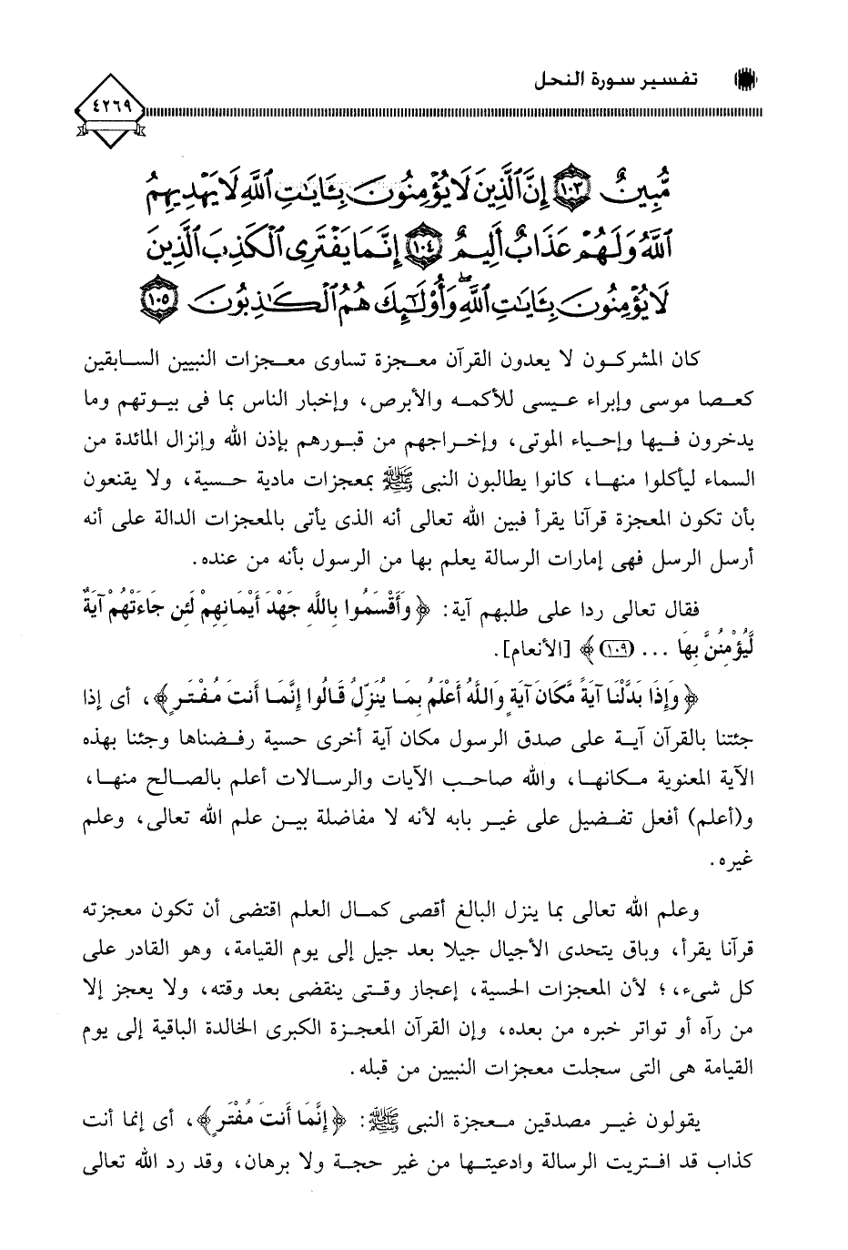 (وَإِذَا بَدَّلْنَا آيَةً مَكَانَ آيَةٍ وَاللَّهُ أَعْلَمُ بِمَا يُنَزِّلُ قَالُوا إِنَّمَا أَنْتَ مُفْتَرٍ)، أي إذا جئتنا بالقرآن آية على صدق الرسول مكان آية أخرى حسية رفضناها وجئنا بهذه الآية المعنوية مكانها، واللَّه صاحب الآيات والرسالات أعلم بالصالح منها، و (أعلم) أفعل تفضيل على غير بابه لأنه لَا مفاضلة بين علم الله تعالى، وعلم غيره.