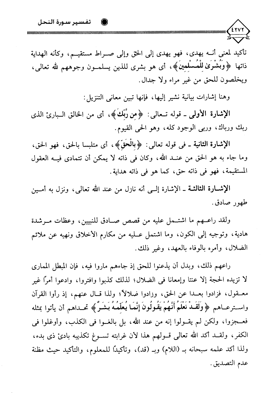 الإشارة الثالثة - الإشارة إلى أنه نازل من عند اللَّه تعالى، ونزل به أمين طهور صادق.