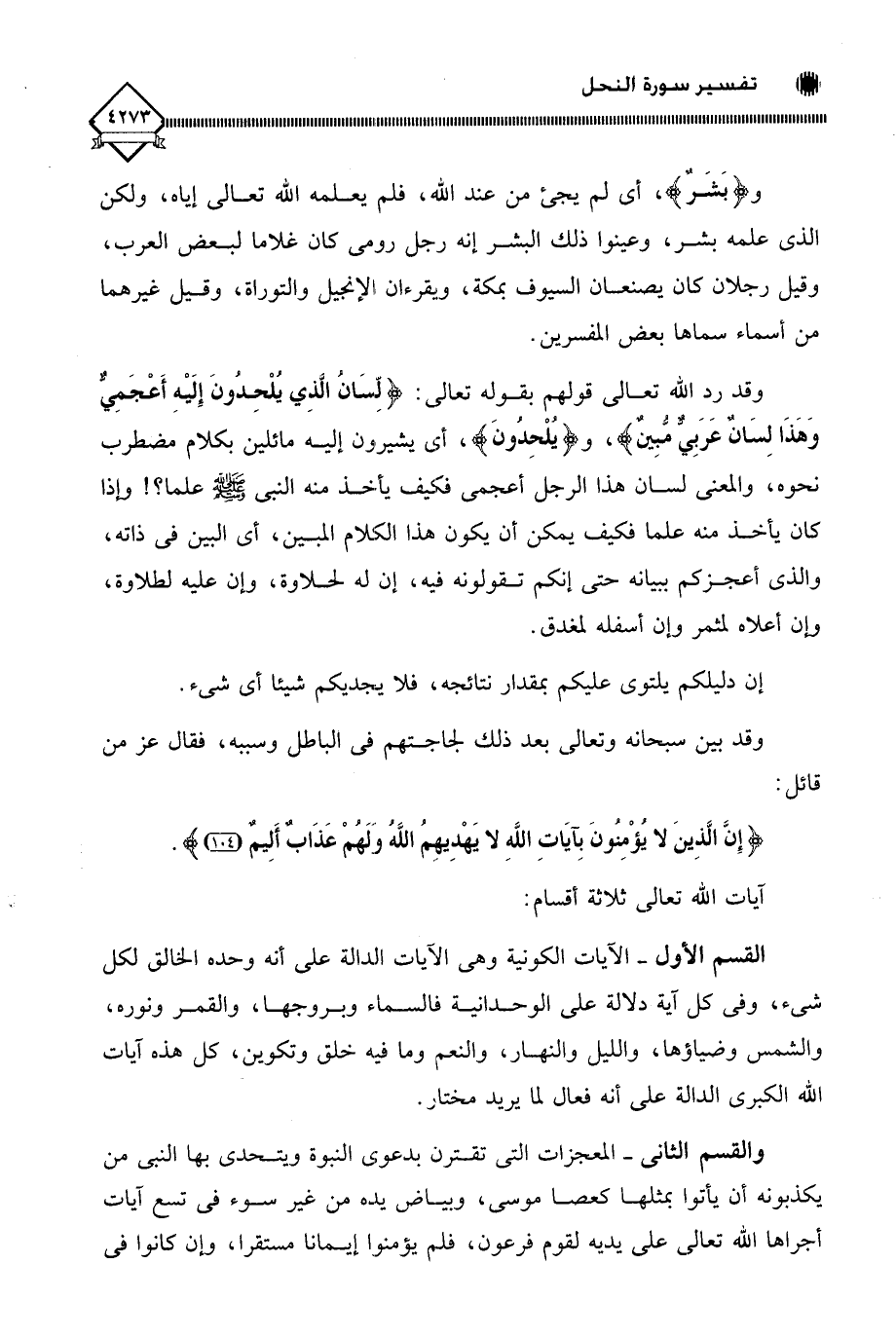 وقد رد الله تعالى قولهم بقوله تعالى: (لِسَانُ الَّذِي يُلْحِدُونَ إِلَيْهِ أَعْجَمِيٌّ وَهَذَا لِسَانٌ عَرَبِيٌّ مُبِينٌ)، و (يُلْحِدُونَ)، أي يشيرون إليه مائلين بكلام مضطرب نحوه، والمعنى لسان هذا الرجل أعجمي فكيف يأخذ منه النبي - صلى الله عليه وسلم - علما؟! وإذا كان يأخذ منه علما فكيف يمكن أن يكون هذا الكلام المبين، أي البين في ذاته، والذي أعجزكم ببيانه حتى إنكم تقولونه فيه، إن له لحلاوة، وإن عليه لطلاوة، وإن أعلاه لمثمر وإن أسفله لمغدق.
