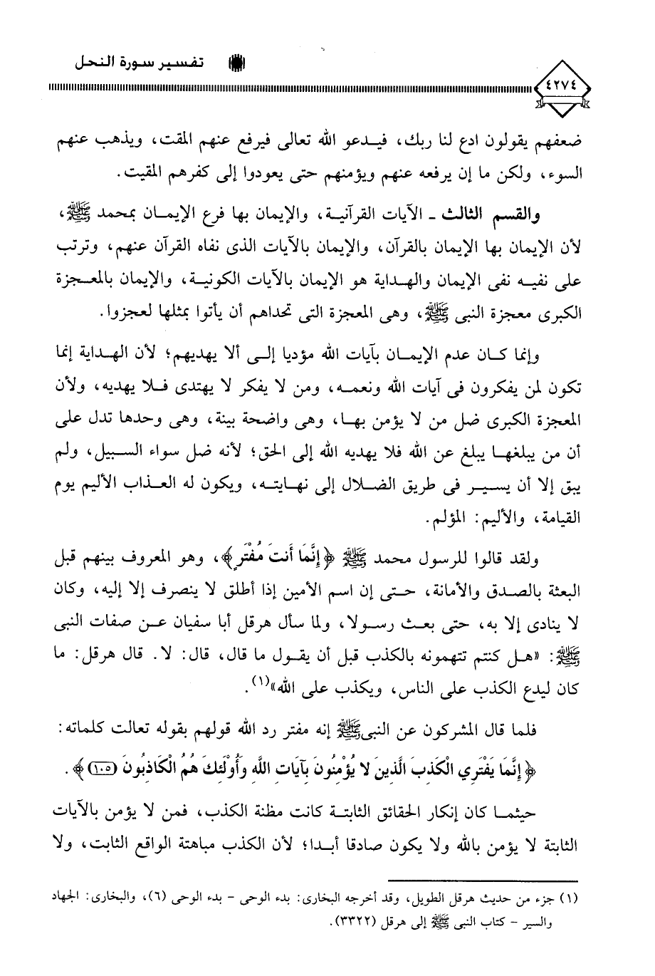 ضعفهم يقولون ادع لنا ربك، فيدعو اللَّه تعالى فيرفع عنهم المقت، ويذهب عنهم السوء، ولكن ما إن يرفعه عنهم ويؤمنهم حتى يعودوا إلى كفرهم المقيت. والقسم الثالث - الآيات القرآنية، والإيمان بها فرع الإيمان بمحمد - صلى الله عليه وسلم -، لأن الإيمان بها الإيمان بالقرآن، والإيمان بالآيات الذي نفاه القرآن عنهم، وترتب على نفيه نفي الإيمان والهداية هو الإيمان بالآيات الكونية، والإيمان بالمعجزة الكبرى معجزة النبي - صلى الله عليه وسلم -، وهي المعجزة التي تحداهم أن يأتوا بمثلها لعجزوا.