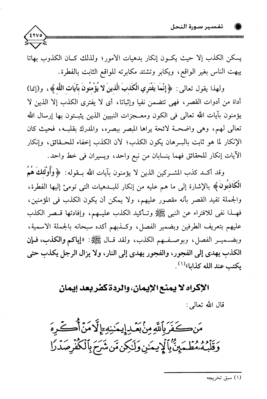 (مَنْ كَفَرَ بِاللَّهِ مِنْ بَعْدِ إِيمَانِهِ إِلَّا مَنْ أُكْرِهَ وَقَلْبُهُ مُطْمَئِنٌّ بِالْإِيمَانِ وَلَكِنْ مَنْ شَرَحَ بِالْكُفْرِ صَدْرًا