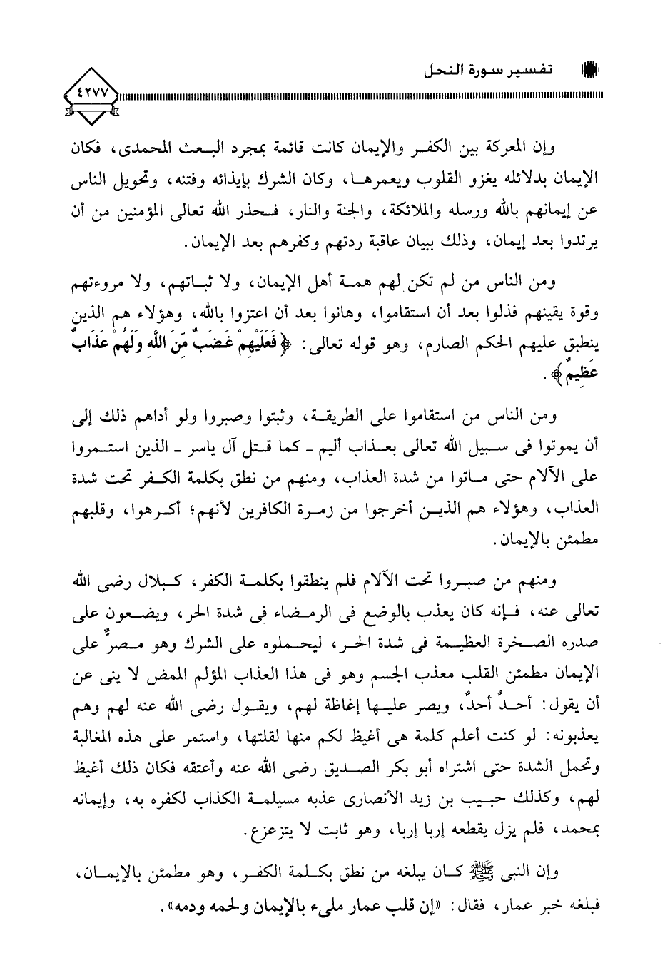 وإن النبي - صلى الله عليه وسلم - كان يبلغه من نطق بكلمة الكفر، وهو مطمئن بالإيمان، فبلغه خبر عمار، فقال: " إن قلب عمار مليء بالإيمان ولحمه ودمه ".