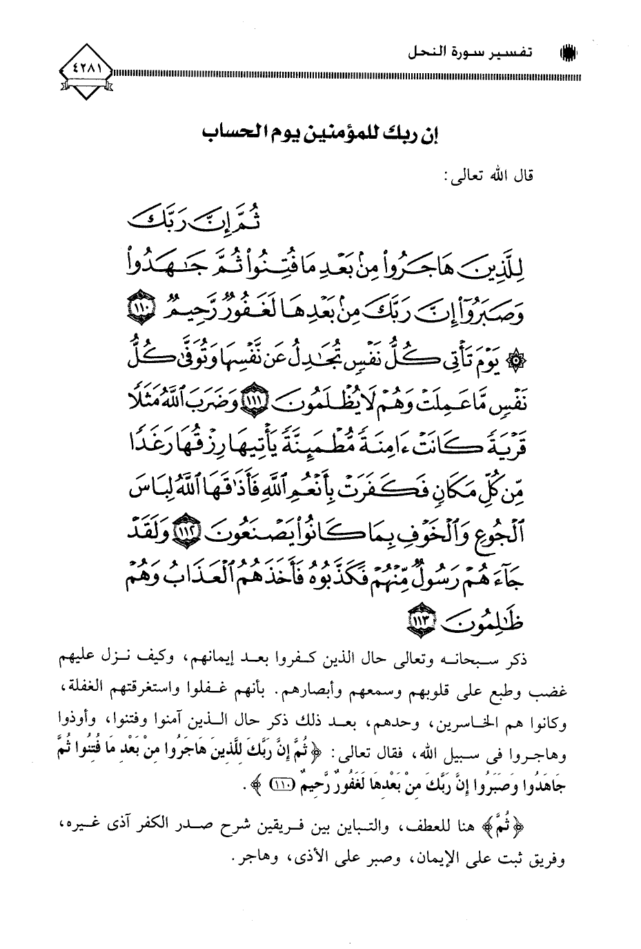 (ثُمَّ إِنَّ رَبَّكَ لِلَّذِينَ هَاجَرُوا مِنْ بَعْدِ مَا فُتِنُوا ثُمَّ جَاهَدُوا وَصَبَرُوا إِنَّ رَبَّكَ مِنْ بَعْدِهَا لَغَفُورٌ رَحِيمٌ (110) يَوْمَ تَأْتِي كُلُّ نَفْسٍ تُجَادِلُ عَنْ نَفْسِهَا وَتُوَفَّى كُلُّ نَفْسٍ مَا عَمِلَتْ وَهُمْ لَا يُظْلَمُونَ (111) وَضَرَبَ اللَّهُ مَثَلًا قَرْيَةً كَانَتْ آمِنَةً مُطْمَئِنَّةً يَأْتِيهَا رِزْقُهَا رَغَدًا مِنْ كُلِّ مَكَانٍ فَكَفَرَتْ بِأَنْعُمِ اللَّهِ فَأَذَاقَهَا اللَّهُ لِبَاسَ الْجُوعِ وَالْخَوْفِ بِمَا كَانُوا يَصْنَعُونَ (112) وَلَقَدْ جَاءَهُمْ رَسُولٌ مِنْهُمْ فَكَذَّبُوهُ فَأَخَذَهُمُ الْعَذَابُ وَهُمْ ظَالِمُونَ (113)
