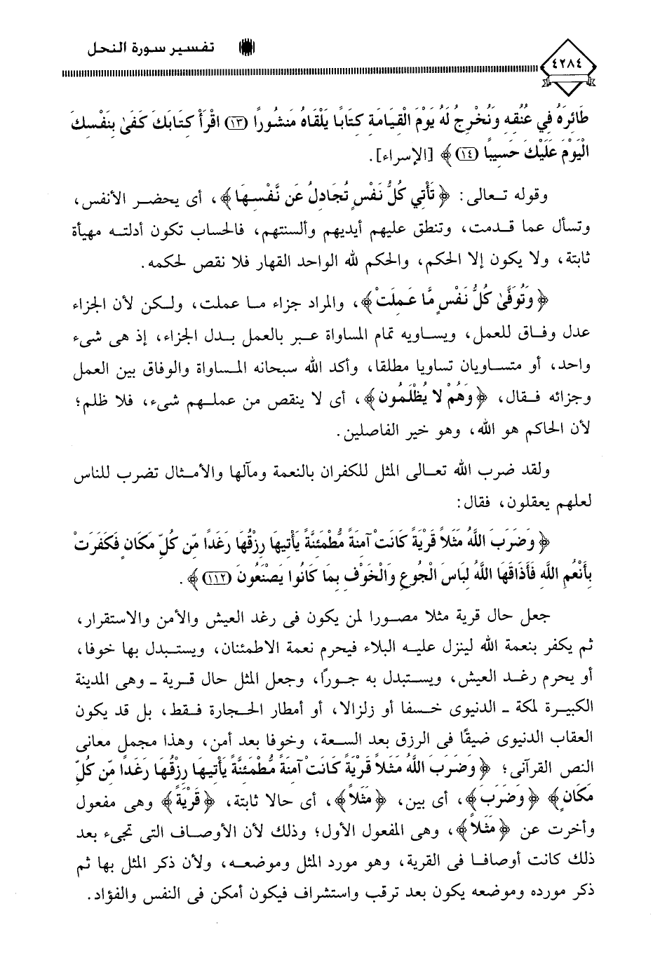 (وَضَرَبَ اللَّهُ مَثَلًا قَرْيَةً كَانَتْ آمِنَةً مُطْمَئِنَّةً يَأْتِيهَا رِزْقُهَا رَغَدًا مِنْ كُلِّ مَكَانٍ فَكَفَرَتْ بِأَنْعُمِ اللَّهِ فَأَذَاقَهَا اللَّهُ لِبَاسَ الْجُوعِ وَالْخَوْفِ بِمَا كَانُوا يَصْنَعُونَ (112)