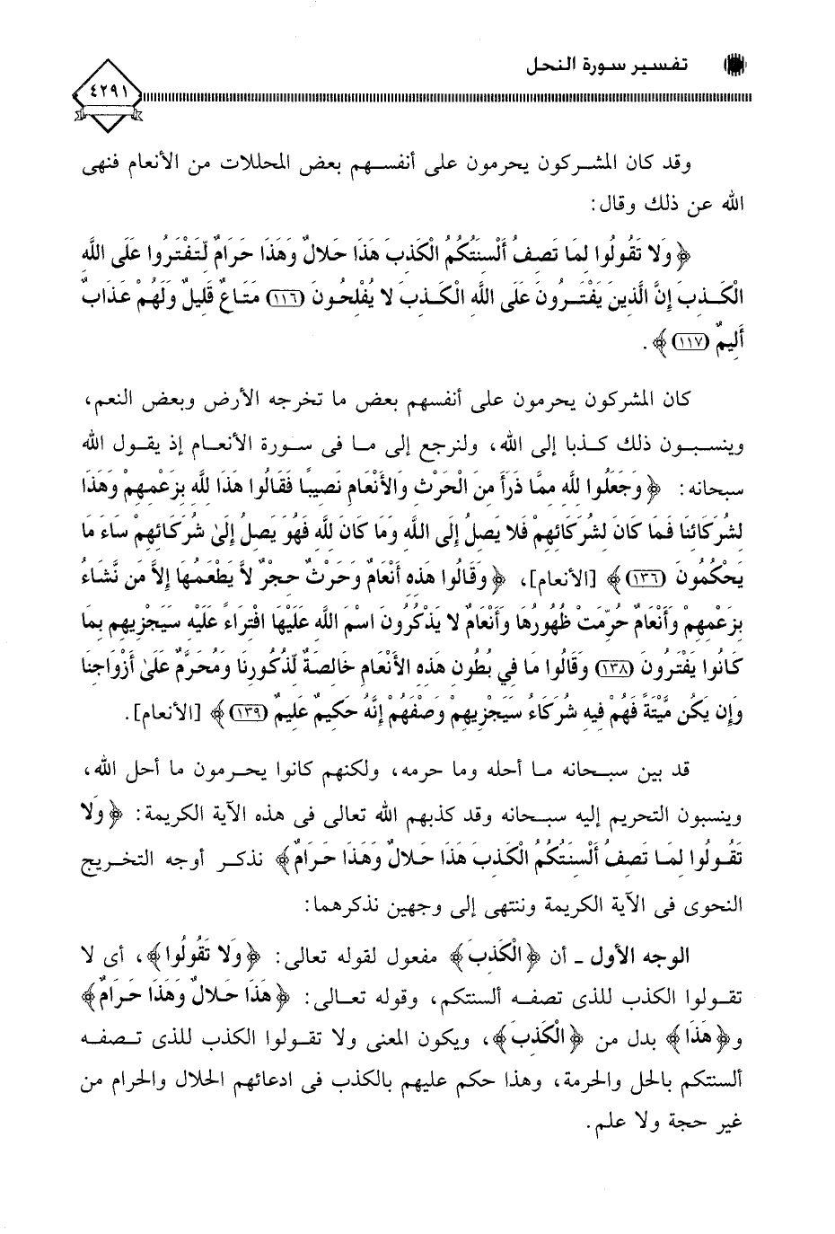 قد بين سبحانه ما أحله وما حرمه، ولكنهم كانوا يحرمون ما أحل اللَّه، وينسبون التحريم إليه سبحانه وقد كذبهم اللَّه تعالى في هذه الآية الكريمة: (وَلا تَقُولُوا لِمَا تَصِفُ أَلْسِنَتُكُمُ الْكَذِبَ هَذَا حَلالٌ وَهَذَا حَرَامٌ) نذكر أوجه التخريج النحوي في الآية الكريمة وننتهي إلى وجهين نذكرهما: