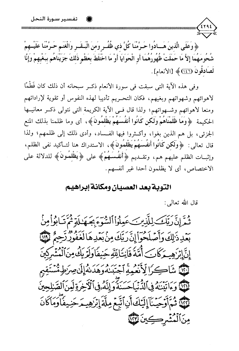 (ثُمَّ إِنَّ رَبَّكَ لِلَّذِينَ عَمِلُوا السُّوءَ بِجَهَالَةٍ ثُمَّ تَابُوا مِنْ بَعْدِ ذَلِكَ وَأَصْلَحُوا إِنَّ رَبَّكَ مِنْ بَعْدِهَا لَغَفُورٌ رَحِيمٌ (119) إِنَّ إِبْرَاهِيمَ كَانَ أُمَّةً قَانِتًا لِلَّهِ حَنِيفًا وَلَمْ يَكُ مِنَ الْمُشْرِكِينَ (120) شَاكِرًا لِأَنْعُمِهِ اجْتَبَاهُ وَهَدَاهُ إِلَى صِرَاطٍ مُسْتَقِيمٍ (121) وَآتَيْنَاهُ فِي الدُّنْيَا حَسَنَةً وَإِنَّهُ فِي الْآخِرَةِ لَمِنَ الصَّالِحِينَ (122) ثُمَّ أَوْحَيْنَا إِلَيْكَ أَنِ اتَّبِعْ مِلَّةَ إِبْرَاهِيمَ حَنِيفًا وَمَا كَانَ مِنَ الْمُشْرِكِينَ (123)