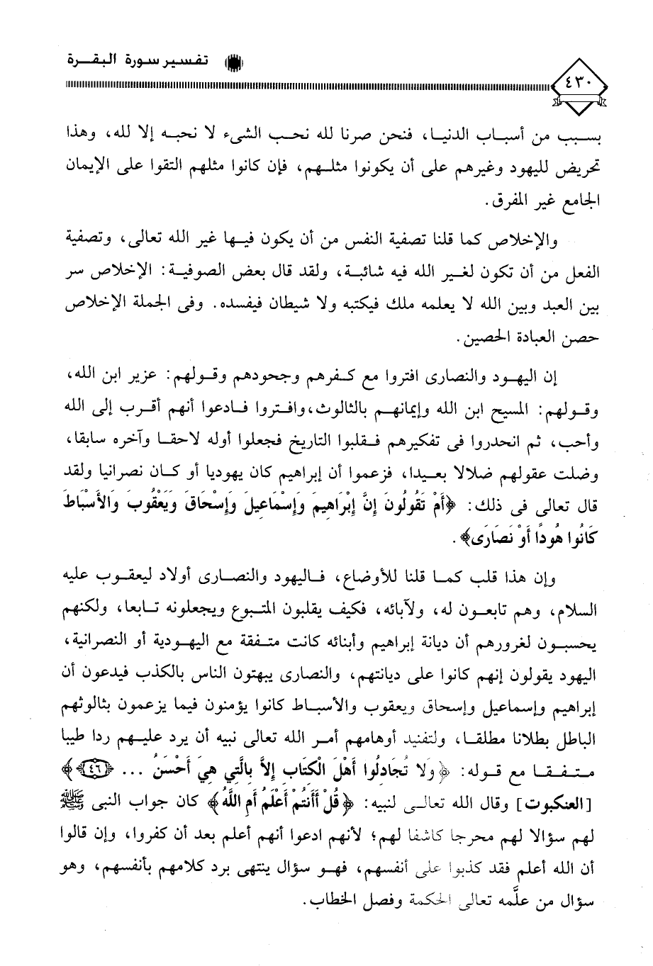 وإن هذا قلب كما قلنا للأوضاع، فاليهود والنصارى أولاد ليعقوب عليه السلام، وهم تابعون له، ولآبائه، فكيف يقلبون المتبوع ويجعلونه تابعا، ولكنهم يحسبون لغرورهم أن ديانة إبراهيم وأبنائه كانت متفقة مع اليهودية أو النصرانية، اليهود يقولون إنهم كانوا على ديانتهم، والنصارى يبهتون الناس بالكذب فيدعون أن إبراهيم وإسماعيل وإسحاق ويعقوب والأسباط كانوا يؤمنون فيما يزعمون بثالوثهم الباطل بطلانا مطلقا، ولتفنيد أوهامهم أمر الله تعالى نبيه أن يرد عليهم ردا طيبا متفقا مع قوله: (وَلا تُجَادِلُوا أَهْلَ الْكِتَاب إِلَّا بِالَّتِي هِيَ أَحْسَنُ. . .)