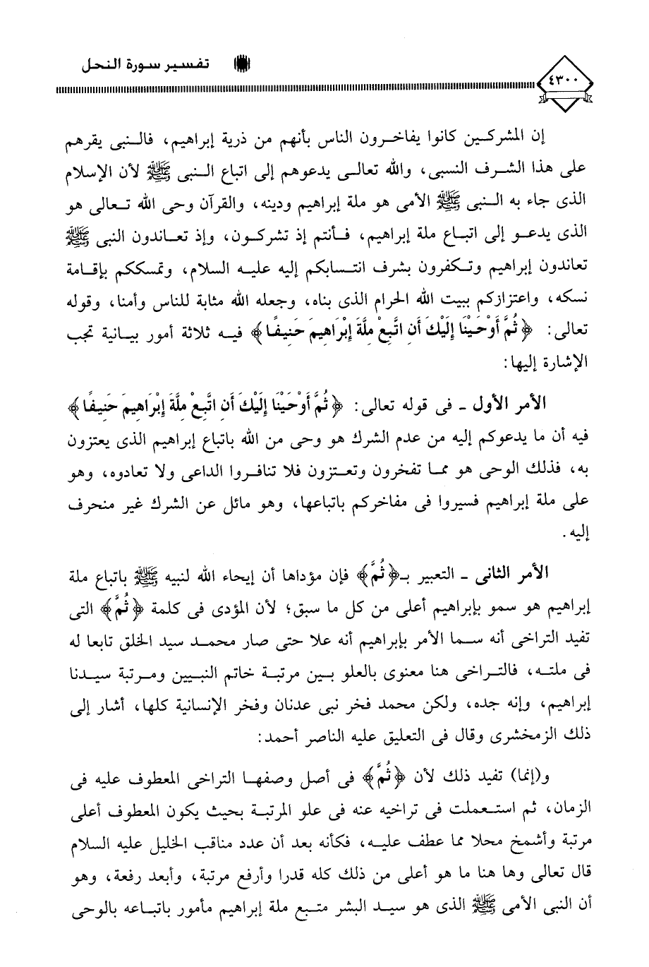 الأمر الثاني - التعبير بـ (ثُمَّ) فإن مؤداها أن إيحاء اللَّه لنبيه - صلى الله عليه وسلم - باتباع ملة إبراهيم هو سمو بإبراهيم أعلى من كل ما سبق، لأن المؤدى في كلمة (ثُمَّ) التي تفيد التراخي أنه سما الأمر بإبراهيم أنه علا حتى صار محمد سيد الخلق تابعا له في ملته، فالتراخي هنا معنوي بالعلو بين مرتبة خاتم النبيين ومرتبة سيدنا إبراهيم، وإنه جده، ولكن محمد فخر نبي عدنان وفخر الإنسانية كلها، أشار إلى ذلك الزمخشري وقال في التعليق عليه الناصر أحمد: