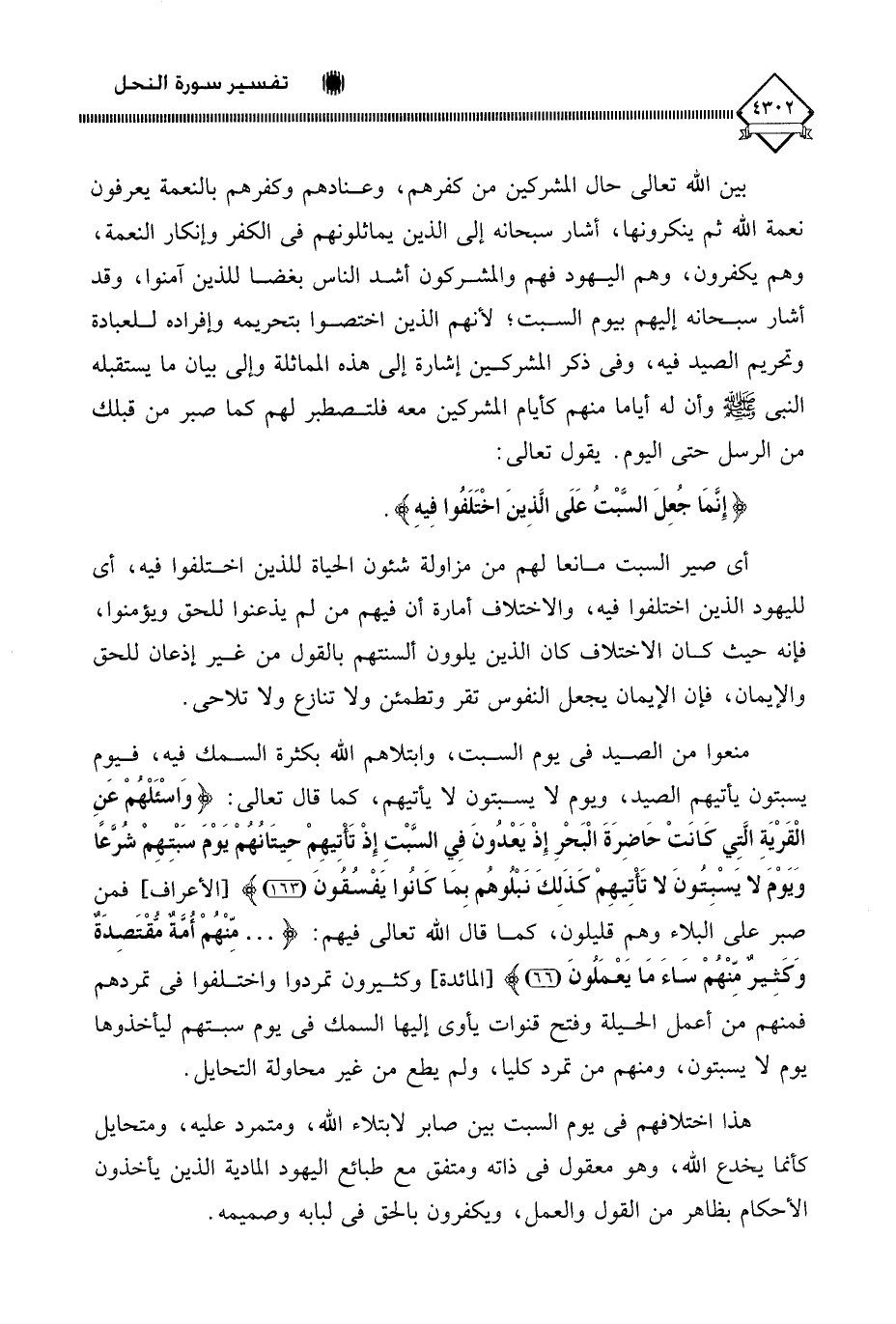 بين اللَّه تعالى حال المشركين من كفرهم، وعنادهم وكفرهم بالنعمة يعرفون نعمة اللَّه ثم ينكرونها، أشار سبحانه إلى الذين يماثلونهم في الكفر وإنكار النعمة، وهم يكفرون، وهم اليهود فهم والمشركون أشد الناس بغضا للذين آمنوا، وقد أشار سبحانه إليهم بيوم السبت؛ لأنهم الذين اختصوا بتحريمه وإفراده للعبادة وتحريم الصيد فيه، وفي ذكر المشركين إشارة إلى هذه المماثلة وإلى بيان ما يستقبله النبي - صلى الله عليه وسلم - وأن له أياما منهم كأيام المشركين معه فلتصطبر لهم كما صبر من قبلك من الرسل حتى اليوم. يقول تعالى: