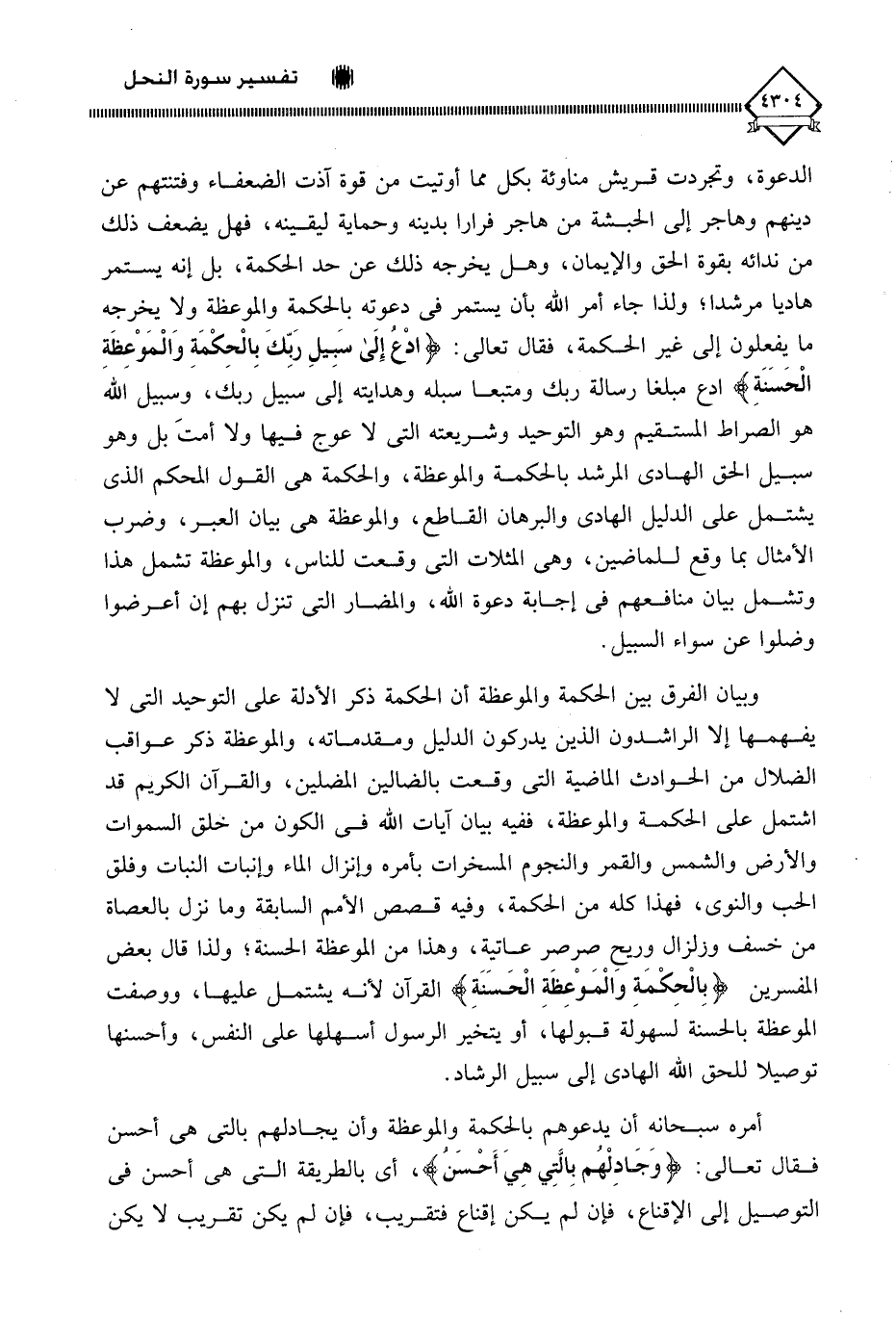 الدعوة، وتجردت قريش مناوئة بكل مما أوتيت من قوة آذت الضعفاء وفتنتهم عن دينهم وهاجر إلى الحبشة من هاجر فرارا بدينه وحماية ليقينه، فهل يضعف ذلك من ندائه بقوة الحق والإيمان، وهل يخرجه ذلك عن حد الحكمة، بل إنه يستمر هاديا مرشدا؛ ولذا جاء أمر اللَّه بأن يستمر في دعوته بالحكمة والموعظة ولا يخرجه ما يفعلون إلى غير الحكمة، فقال تعالى: (ادْعُ إِلَى سَبِيلِ رَبِّكَ بِالْحِكْمَةِ وَالْمًوْعِظَةِ الْحَسَنَةِ) ادع مبلغا رسالة ربك ومتبعا سبله وهدايته إلى سبيل ربك، وسبيل اللَّه هو الصراط المستقيم وهو التوحيد وشريعته التي لَا عوج فيها ولا أمتَ بل وهو سبيل الحق الهادي المرشد بالحكمة والموعظة، والحكمة هي القول المحكم الذي يشتمل على الدليل الهادي والبرهان القاطع، والموعظة هي بيان العبر، وضرب الأمثال بما وقع للماضين، وهي المثلات التي وقعت للناس، والموعظة تشمل هذا وتشمل بيان منافعهم في إجابة دعوة اللَّه، والمضار التي تنزل بهم إن أعرضوا وضلوا عن سواء السبيل.