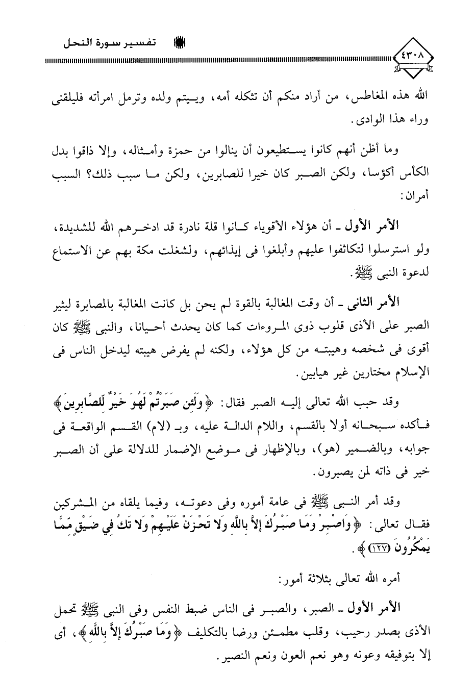 (وَاصْبِرْ وَمَا صَبْرُكَ إِلَّا بِاللَّهِ وَلَا تَحْزَنْ عَلَيْهِمْ وَلَا تَكُ فِي ضَيْقٍ مِمَّا يَمْكُرُونَ (127) أمره اللَّه تعالى بثلاثة أمور: