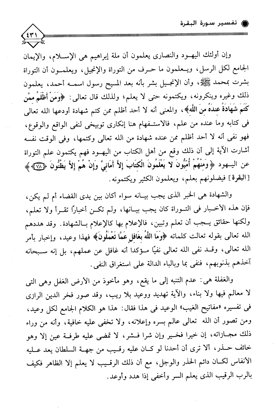 والشهادة هي الخبر الذي يجب بيانه سواء أكان بين يدي القضاء أم لم يكن، فإن هذه الأخبار في التوراة كان يجب بيانها، ولم تكن أخبارًا تقرأ ولا تعلم، ولكنها حقائق يجب أن تعلم وتبين، فالإعلام بها كالإعلام بالشهادة. وقد هددهم الله تعالى بقوله تعالت كلماته (وَمَا اللَّهُ بِغَافِلٍ عَمَّا تَعْمَلُونَ) فهذا وعيد، وإخبار بأمر الله تعالى، وقد نفَى الله تعالى نفيًا مؤكدا أنه غافل عن عملهم، بل إنه سبحانه آخذهم بذنوبهم، فنفَى بما وبالباء الدالة على استغراق النفي.