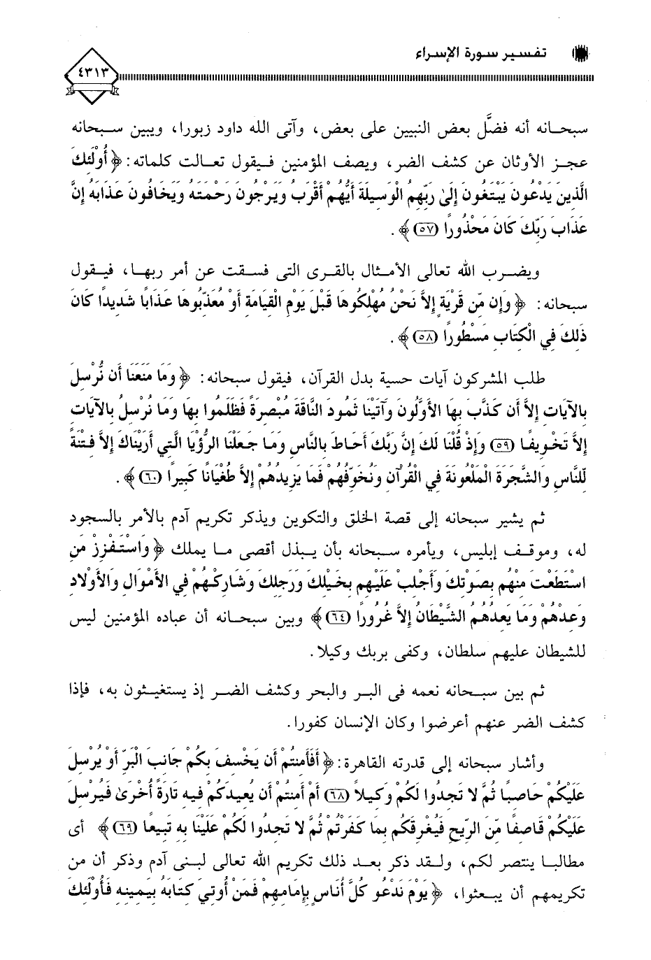 سبحانه أنه فضَّل بعض النبيين على بعض، وآتى الله داود زبورا، ويبين سبحانه عجز الأوثان في كشف الضر، ويصف المؤمنين فيقول تعالت كلماته: (أُولَئِكَ الَّذِينَ يَدْعُونَ يَبْتَغُونَ إِلَى رَبِّهِمُ الْوَسِيلَةَ أَيُّهُمْ أَقْرَبُ وَيَرْجُونَ رَحْمَتَهُ وَيَخَافُونَ عَذَابَهُ إِنَّ عَذَابَ رَبِّكَ كَانَ مَحْذُورًا (57).