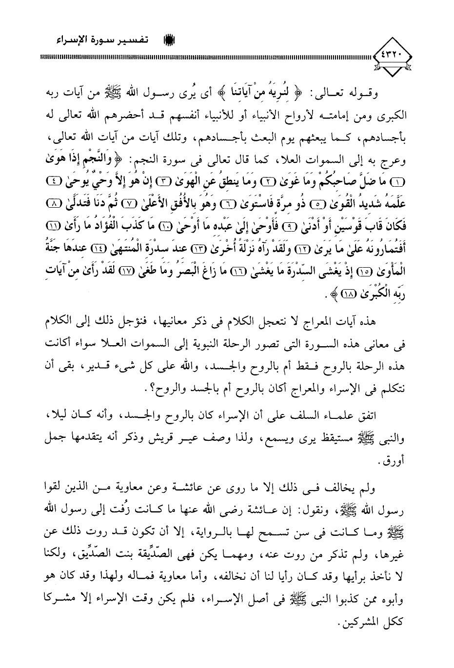 هذه آيات المعراج لَا نتعجل الكلام في ذكر معانيها، فنؤجل ذلك إلى الكلام في معاني هذه السورة التي تصور الرحلة النبوية إلى السماوات العلا سواء أكانت هذه الرحلة بالروح فقط أم بالروح والجسد، واللَّه على كل شيء قدير، بقي أن نتكلم في الإسراء والمعراج أكان بالروح أم بالجسد والروح؟.