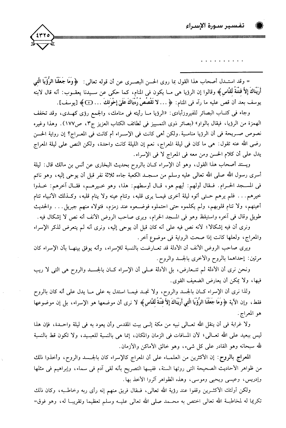 ولذا نرى أن الإسراء كان بالجسد والروح، ولا نجد فيما استدل به على ما يدل على أنه كان بالروح فقط، وإن الآية (وَمَا جَعَلْنَا الرُّؤْيَا الَّتِي أَرَيْنَاكَ إِلَّا فِتْنَةً لِلنَّاسِ) لَا نرى أن موضعها هو الإسراء، بل إن موضوعها هو المعراج.