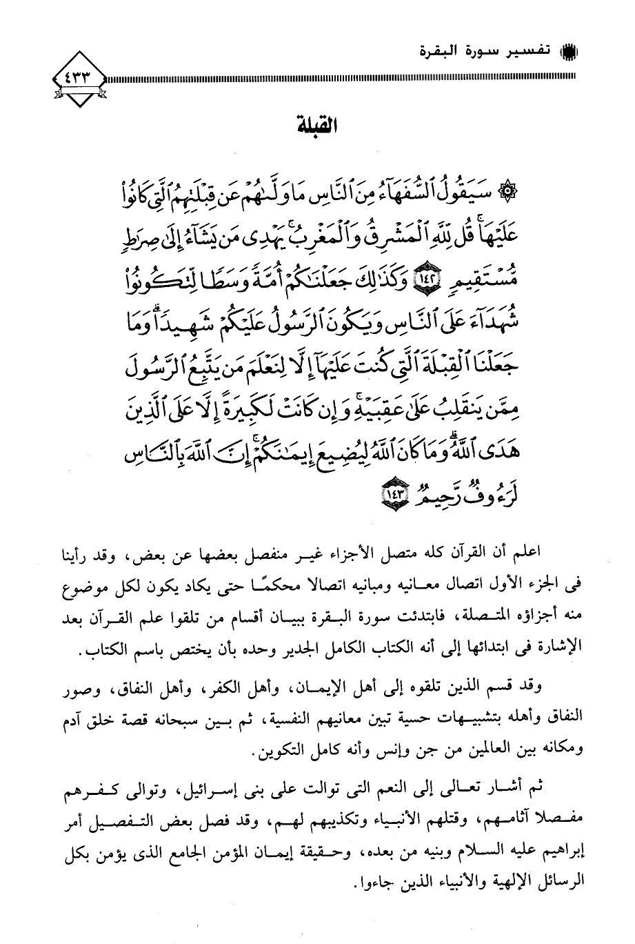 (سَيَقُولُ السُّفَهَاءُ مِنَ النَّاسِ مَا وَلَّاهُمْ عَنْ قِبْلَتِهِمُ الَّتِي كَانُوا عَلَيْهَا قُلْ لِلَّهِ الْمَشْرِقُ وَالْمَغْرِبُ يَهْدِي مَنْ يَشَاءُ إِلَى صِرَاطٍ مُسْتَقِيمٍ (142) وَكَذَلِكَ جَعَلْنَاكُمْ أُمَّةً وَسَطًا لِتَكُونُوا شُهَدَاءَ عَلَى النَّاسِ وَيَكُونَ الرَّسُولُ عَلَيْكُمْ شَهِيدًا وَمَا جَعَلْنَا الْقِبْلَةَ الَّتِي كُنْتَ عَلَيْهَا إِلَّا لِنَعْلَمَ مَنْ يَتَّبِعُ الرَّسُولَ مِمَّنْ يَنْقَلِبُ عَلَى عَقِبَيْهِ وَإِنْ كَانَتْ لَكَبِيرَةً إِلَّا عَلَى الَّذِينَ هَدَى اللَّهُ وَمَا كَانَ اللَّهُ لِيُضِيعَ إِيمَانَكُمْ إِنَّ اللَّهَ بِالنَّاسِ لَرَءُوفٌ رَحِيمٌ (143)